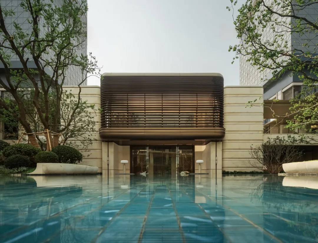 建筑立面以“山水折屏”为概念,GLA建筑设计采用浅灰色铝板与玻璃幕墙的组合,通过横向线条的层叠与竖向框架的分割,模拟山水画的层次感。高层立面通过45度斜切铝板与低辐射玻璃的组合,弱化建筑体量感,同时通过局部金色铝板线条勾勒出山水画的轮廓。