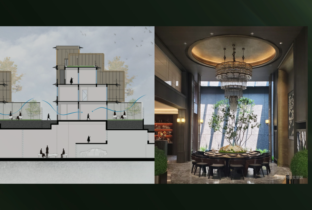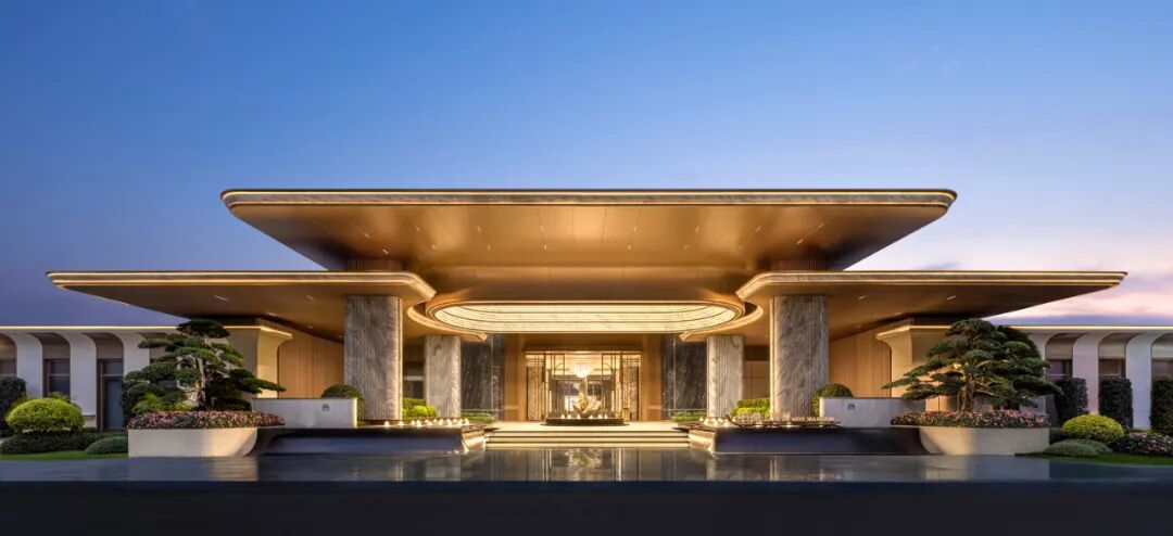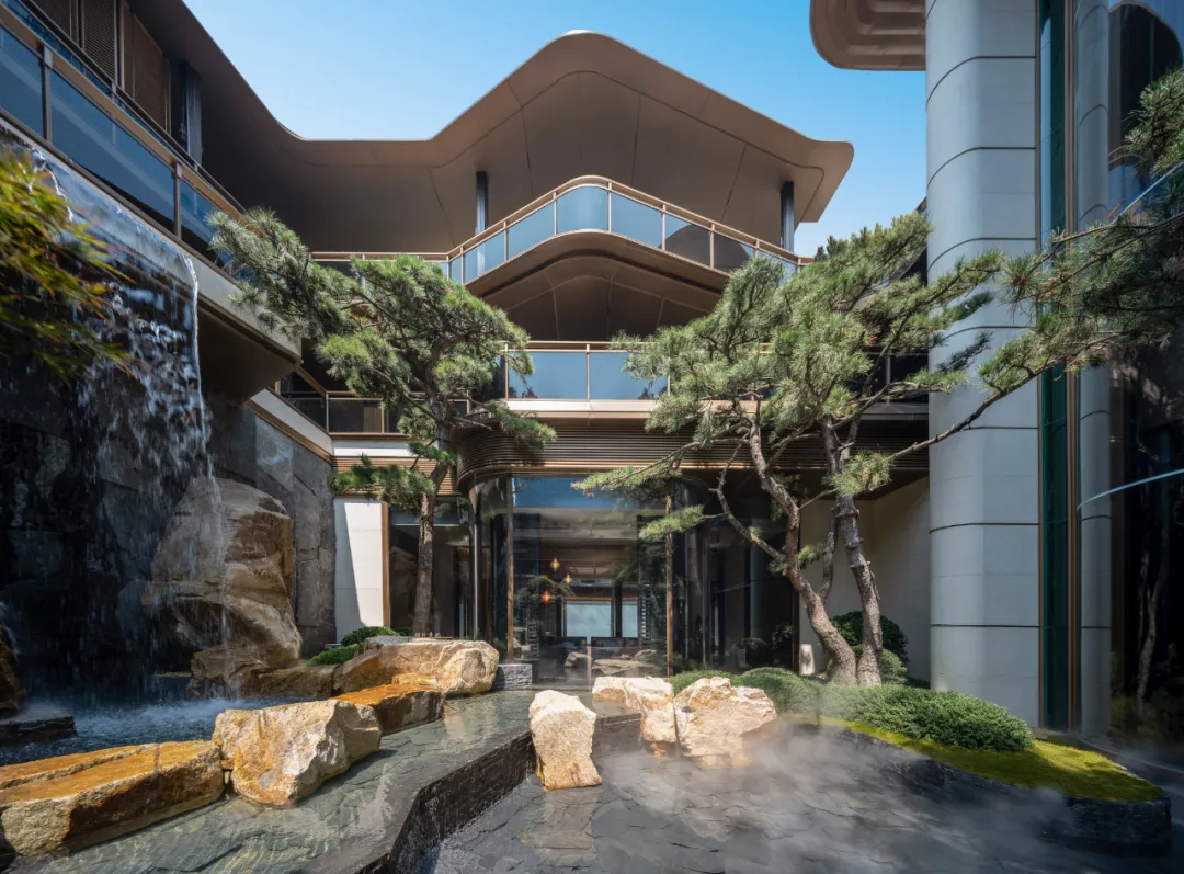 景观以「四境四巷」铺陈东方礼序,「五重归家」轴线串联宽约128米恢弘门庭、约15米叠石飞瀑、约13米榫卯转译的现代穹顶等。
