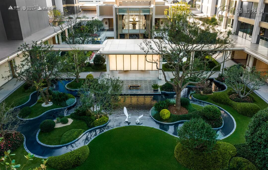 约3300平方米的中央景观,下沉式庭院与双水院景观错落有致,将《松阁观潮图》、《溪山行旅图》、《山亭文会图》三幅宋代古画,巧妙融入松川境的立体山水之中。高层与排屋区之间,一条长约210米的中轴景观横贯东西,串联起「松川十一境」的雅致画卷。该项目景观设计由北京顺景园林执笔。
