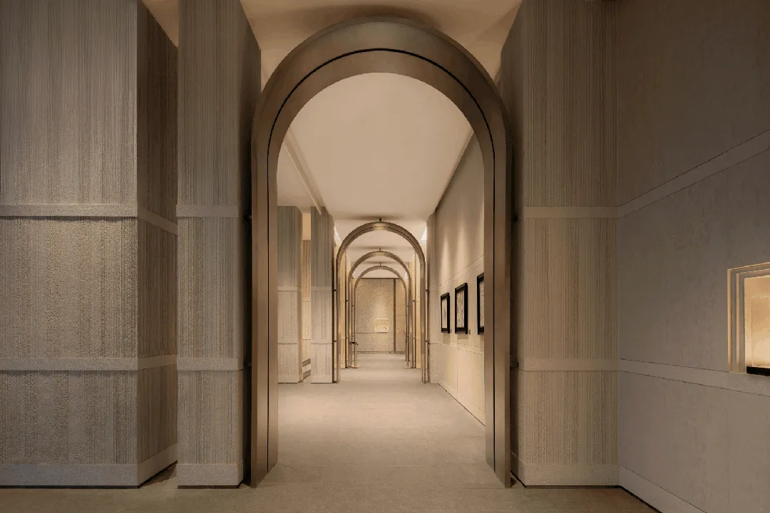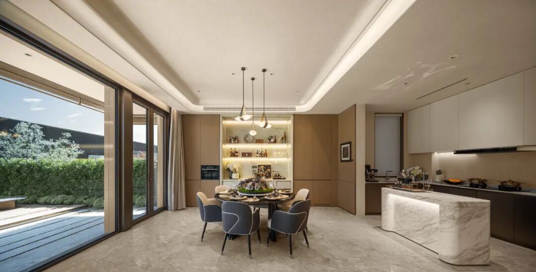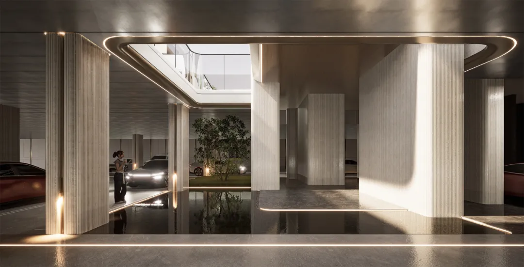 除了地上归家大堂外,依据车行归家的生活习惯,增设奢阔穹顶车马厅,双动线礼序;虽是地下空间,但处处借景自然,光影流转,皆是东方园林的当代转译。