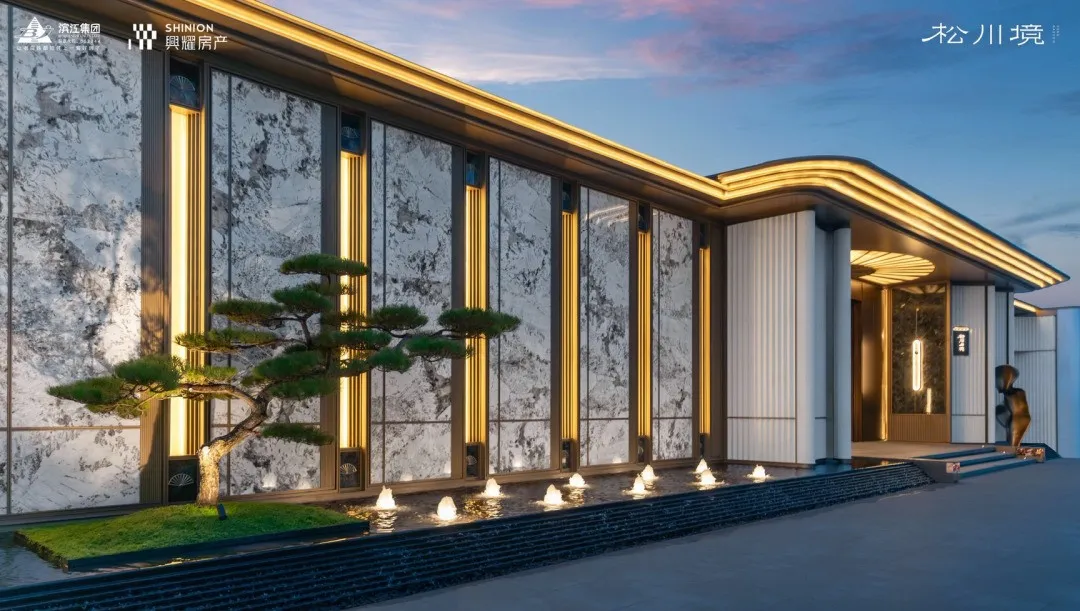 松川境的小区大门,汲取自宋代名画《松阁观潮图》的意境精髓。长达约80米的礼仪门庭,精心选用名贵黑松与约25米长的叠级水景相映成趣,虚实相生。一旁矗立的雕塑《川涌》,以其超长的阵列感,重新诠释了门庭的精神内涵。