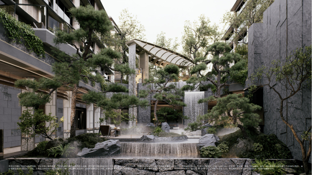 景观中庭的设计是市面上极为少见的三层观景式设计,以北宋画家范宽的《溪山行旅图》为范本,叠石、壑松及高低落差约15米飞瀑,亭台楼阁、檐下的游廊、小桥流水相互映衬,宛如一幅山水画卷。