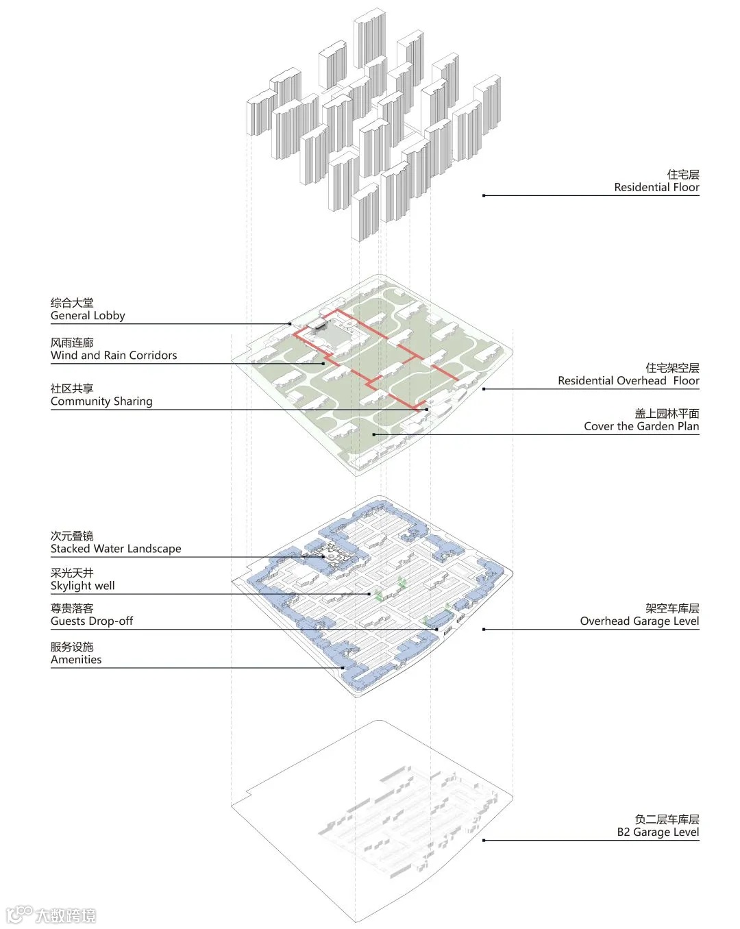 为彻底消融城市与社区的界限,项目以“超级底盘”重构社区基座。通过抬高地库、整合车站与商业配套,将地下空间转化为多功能垂直枢纽。