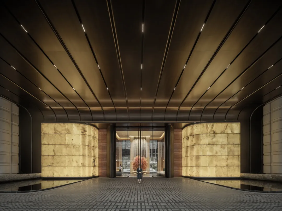 项目大门内外两重门厅景墙运用月光米黄石材近1000 方,搭配香槟金金属线条,汲取爱马仕全球旗舰店的双曲面叠墙造景手法,增加景墙奢华质感。