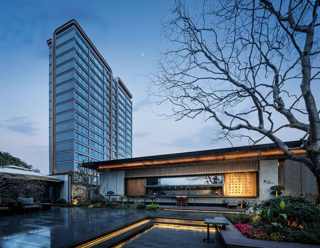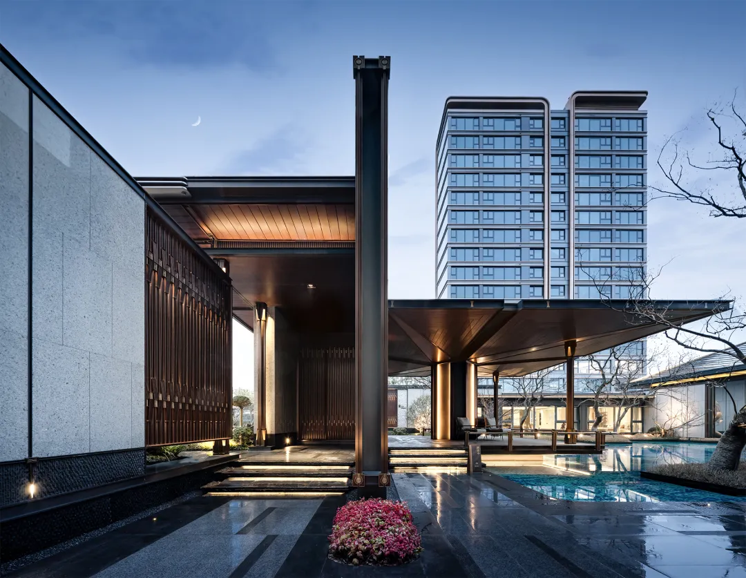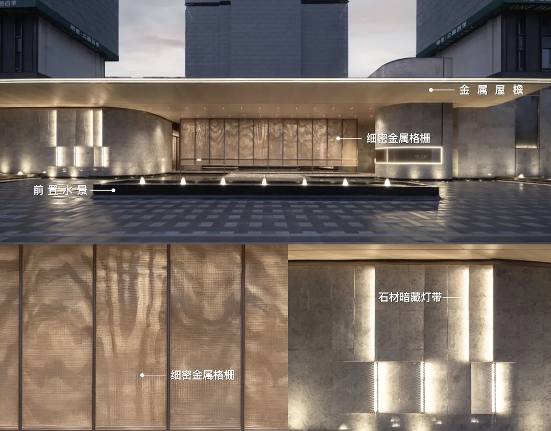 宽大飘逸的金属屋檐由成本更高的木纹铝板密拼而成,平整度经得起各种角度下的阳光照射检验,金属网编织对景屏风与厚重奢石景墙形成视觉的中心与两翼,配合前置水景、地面跳色铺装以及石材开槽内部灯光漫反射。