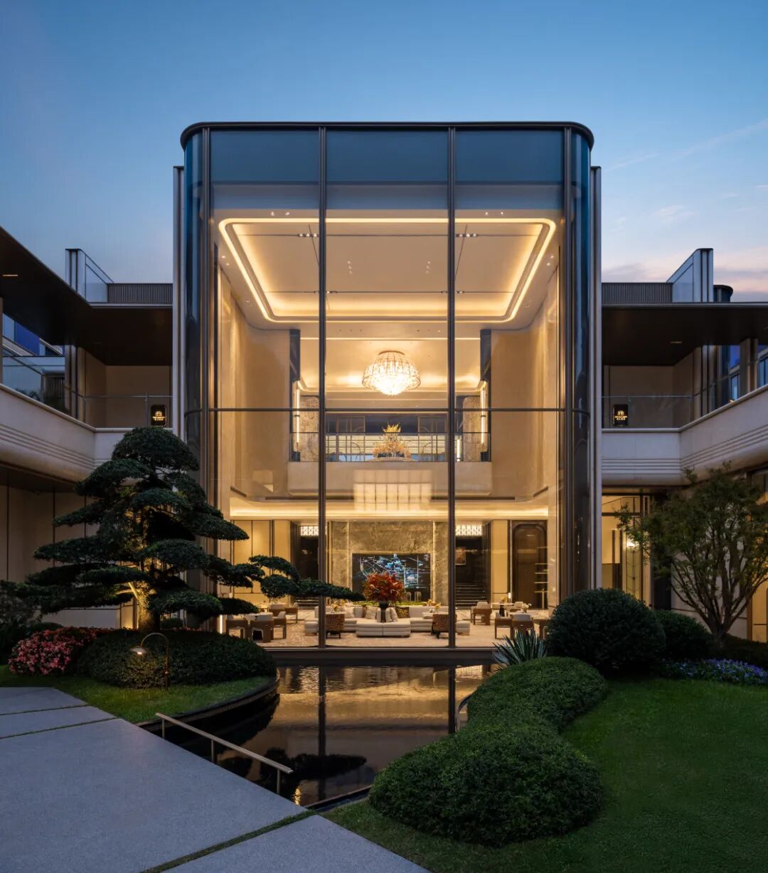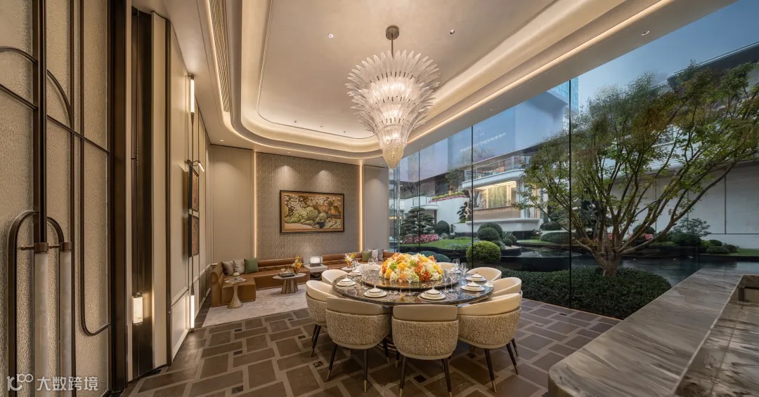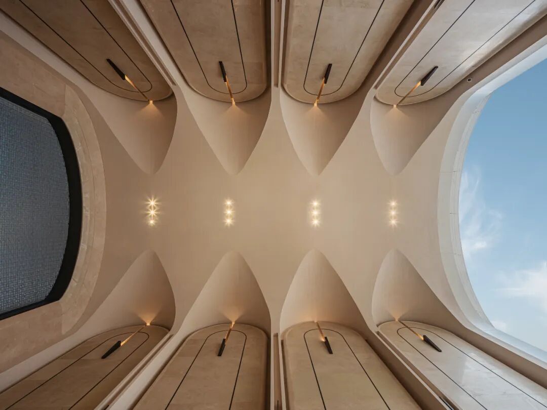 除了地上归家大堂外,依据车行归家的生活习惯,增设奢阔穹顶车马厅,双动线礼序;虽是地下空间,但处处借景自然,光影流转,皆是东方园林的当代转译。