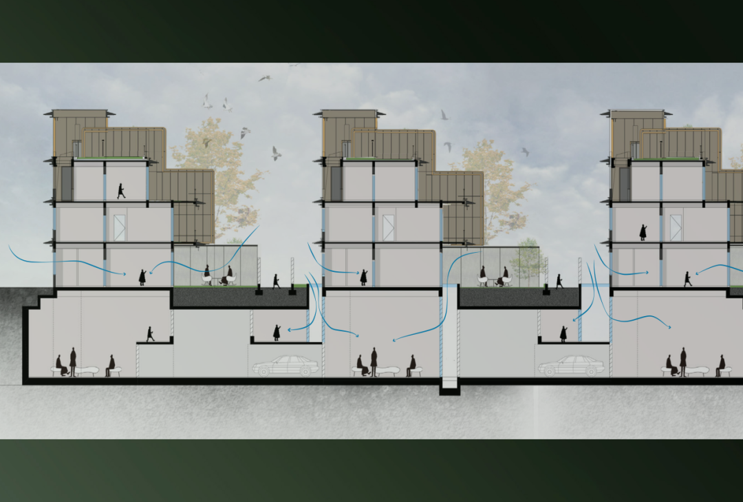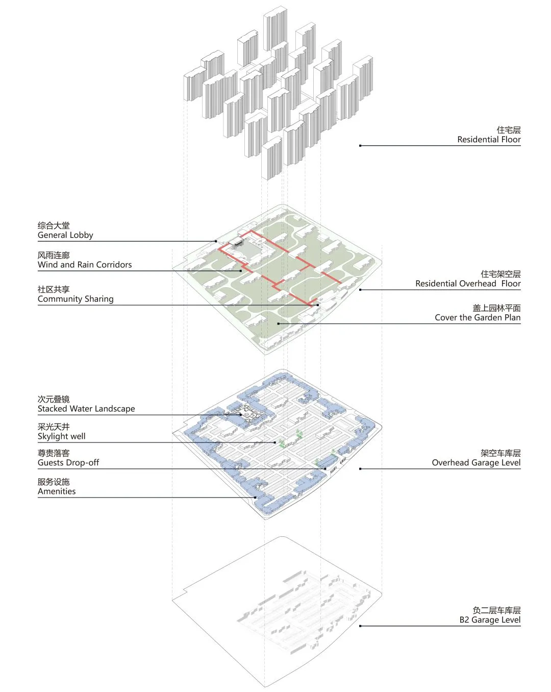 为彻底消融城市与社区的界限,项目以“超级底盘”重构社区基座。通过抬高地库、整合车站与商业配套,将地下空间转化为多功能垂直枢纽。