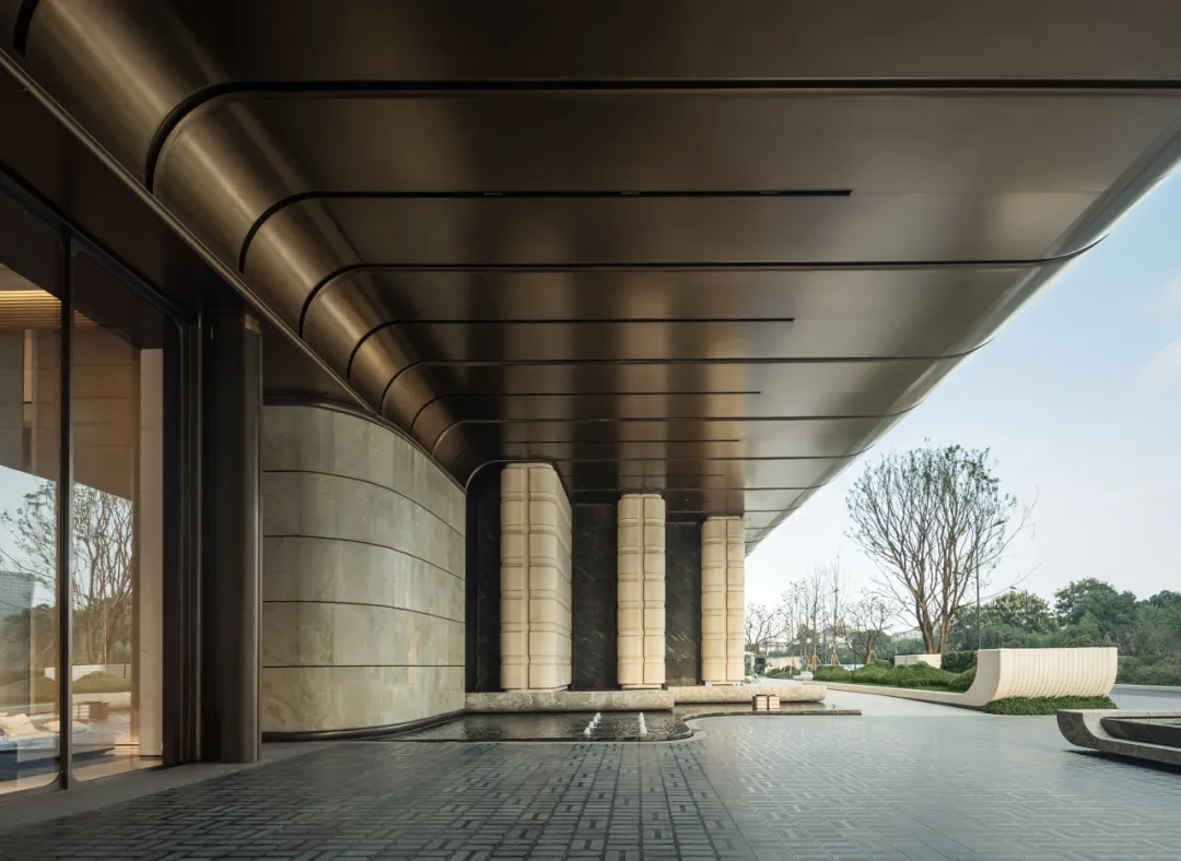 项目大门内外两重门厅景墙运用月光米黄石材近1000 方,搭配香槟金金属线条,汲取爱马仕全球旗舰店的双曲面叠墙造景手法,增加景墙奢华质感。