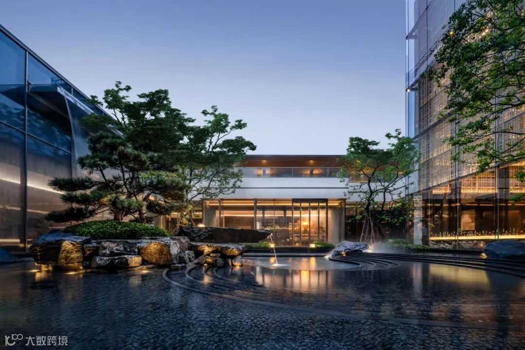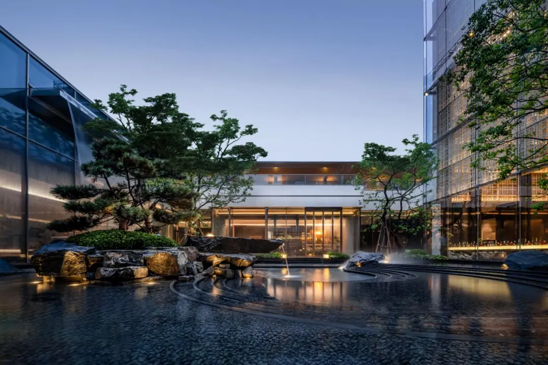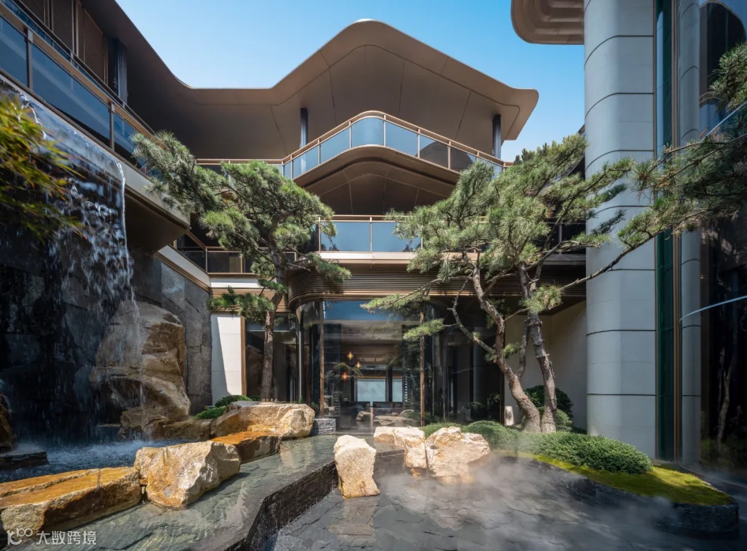 景观以「四境四巷」铺陈东方礼序,「五重归家」轴线串联宽约128米恢弘门庭、约15米叠石飞瀑、约13米榫卯转译的现代穹顶等。