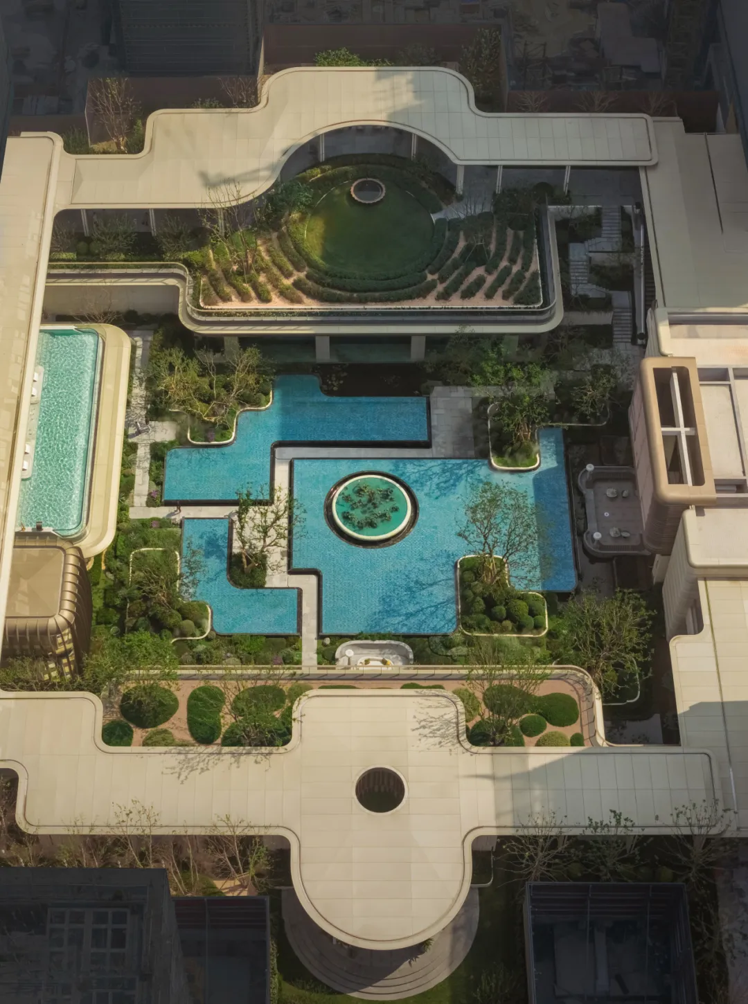 它曲水流觞,绕园而行,直至落差约12米的三层下沉式庭院,化作层层跌落的瀑布,刚柔并济,气象万千。