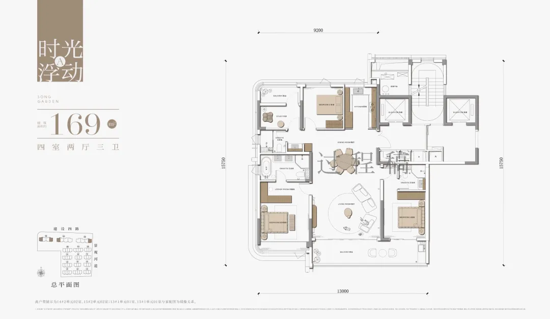 建筑面积169-199㎡的墅境佳宅大平层,三开间朝南,南向面卷达13米,双套房设计,满足三代同堂、二胎家庭等多种生活需求。各个功能间到卫生间的距离也不远,功能布局合理。