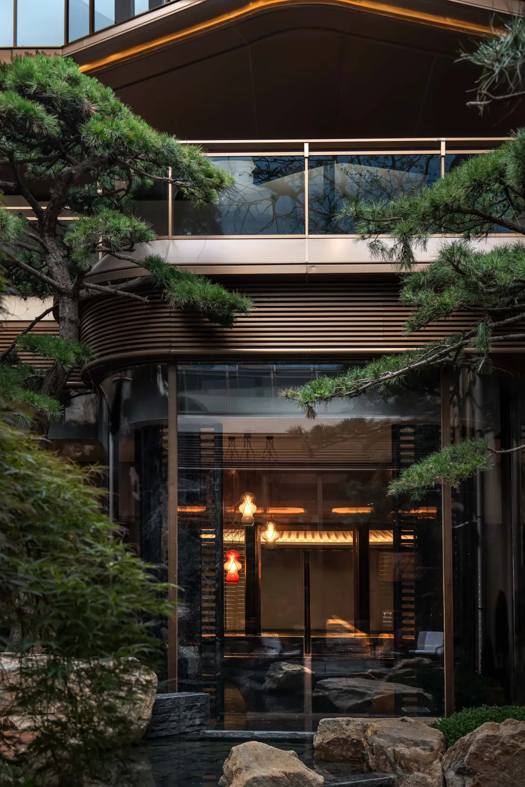 景观以「四境四巷」铺陈东方礼序,「五重归家」轴线串联宽约128米恢弘门庭、约15米叠石飞瀑、约13米榫卯转译的现代穹顶等。