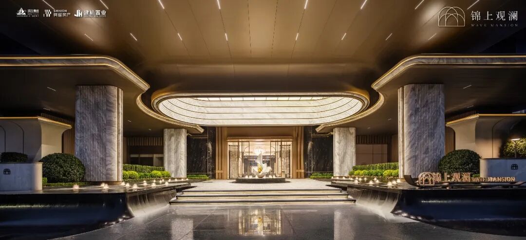 项目大门内外两重门厅景墙运用月光米黄石材近1000 方,搭配香槟金金属线条,汲取爱马仕全球旗舰店的双曲面叠墙造景手法,增加景墙奢华质感。