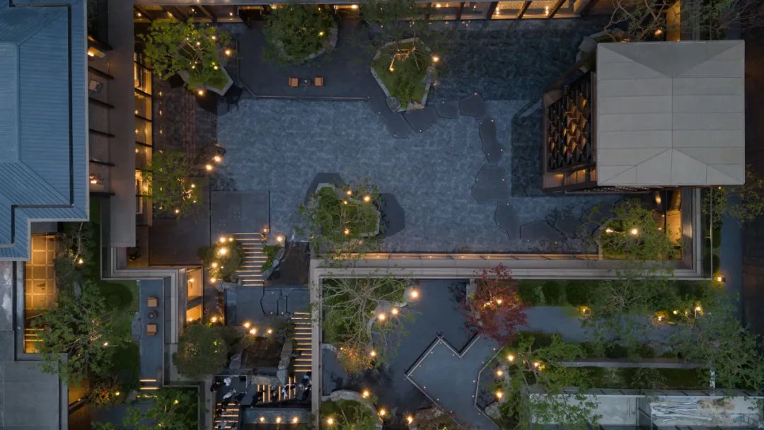 “龙鳞松韵”庭院的造景灵感,源自南宋夏圭笔下的《溪山清远图》。峭壁如屏,五株苍松盘踞奇石之上,疏影横斜间,仿佛能听见画中溪水流淌的泠泠声响。