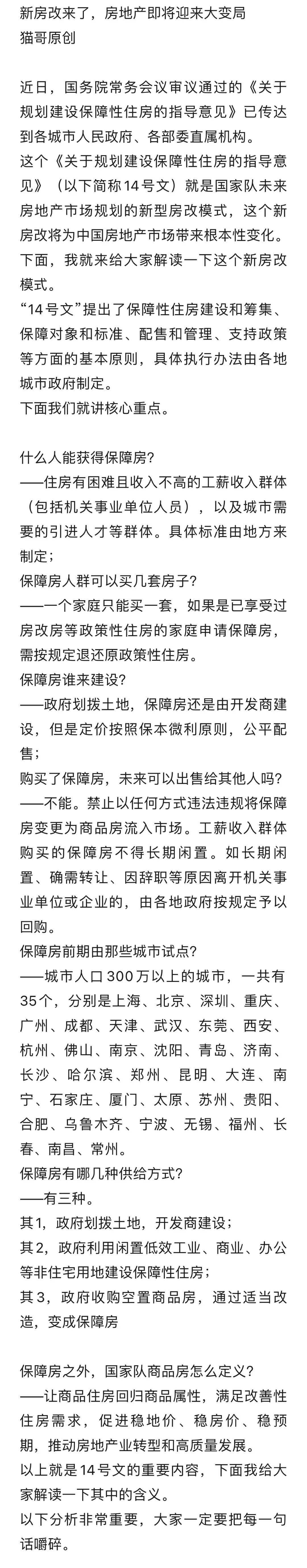 ——国务院常务会议审议通过的《关于规划建设保障性住房的指导意见》已经发布,这次政策将为中国房地产市场带来根本性变化。