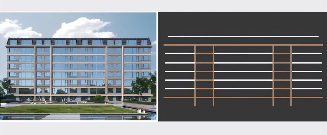 采用类幕墙设计,并加强基座感塑造,赋予整体稳重典雅的形象气质:通过精致层间细部设计,提升立面价值感与精致度。搜建筑