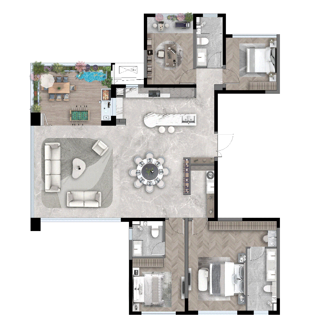 约6米挑高空中花园,构筑约18㎡敞阔空间,匹配客户需求可联动空间形成多元场景定制。南向露台户型连通客厅可打造空中花园,形成家的第二会客厅;北向露台户型连通餐厨空间,可打造成花园餐吧。在这里,休闲观景、户外烧烤,娱乐桌游......一边享受着微风与花香,一边感受着生活的美好与宁静。