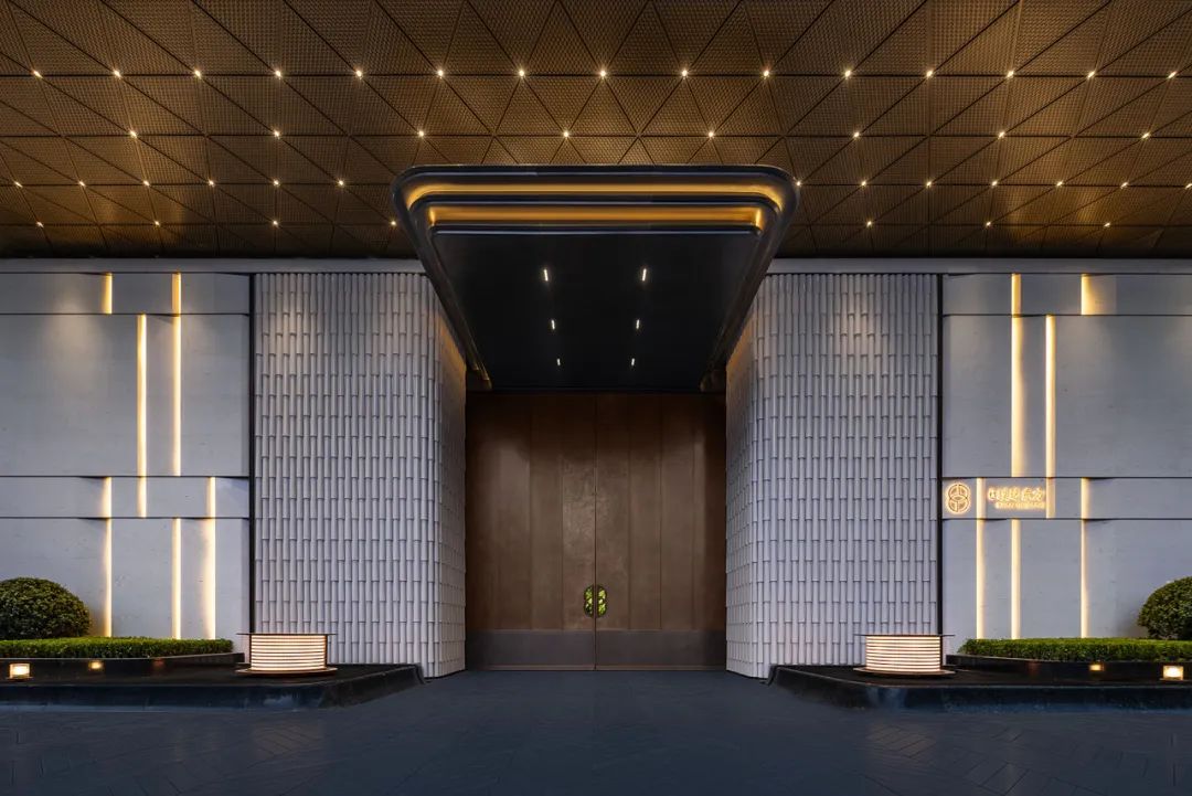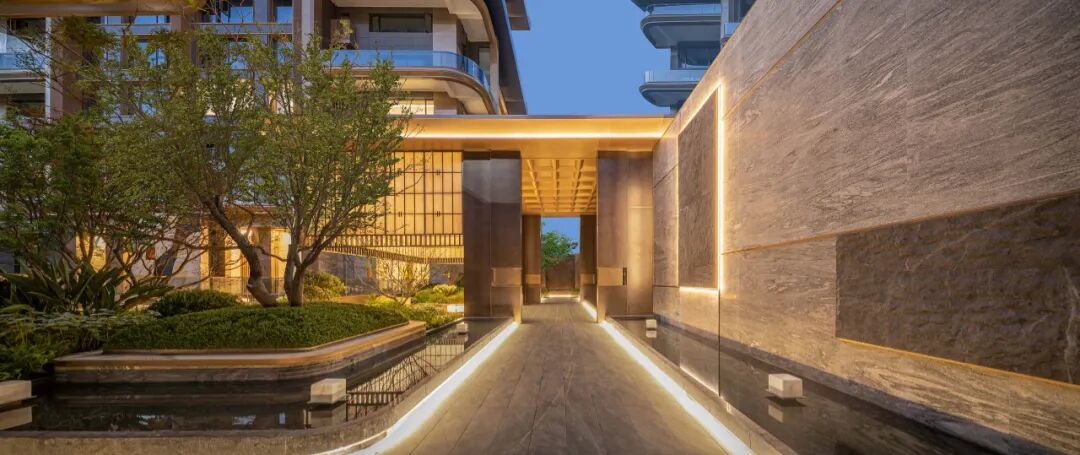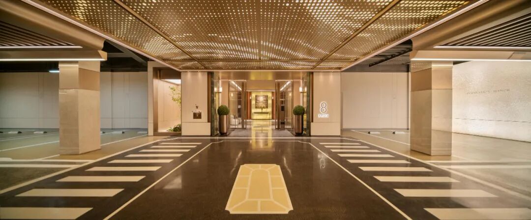 南入口景墙正中的金属屏风则成为整个立面的题眼,由八根细金属柱领衔的“七扇屏”顶奢酒店化门庭式落客空间:形式取意“玉璧飞檐,金凤来栖”的社区大堂,是中式门庭和东方美学的时尚化演绎;