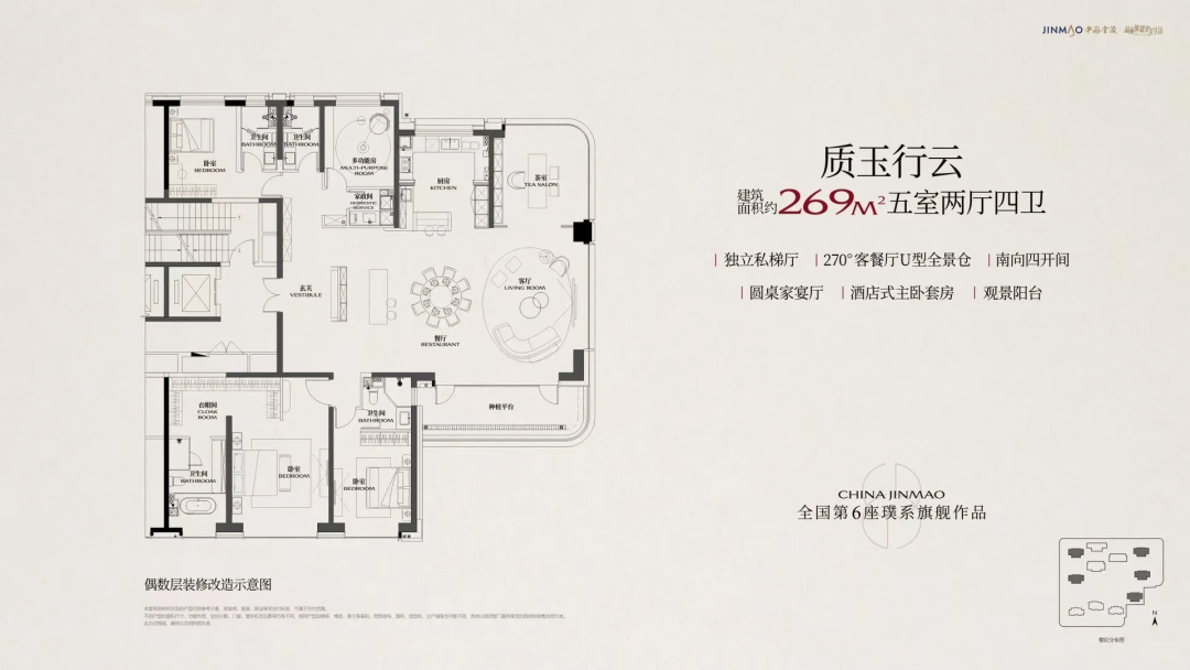 金茂璞逸东方主力产品为229-269-336㎡,其中269㎡、336㎡为全景舱设计。