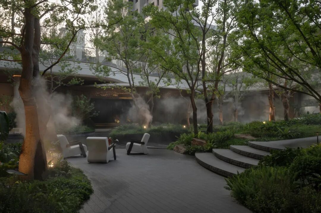 项目景观打造西安首个非标下沉庭院广场,以书吧、森林台地、水景瀑布与花园台地,重构“人在景中游”的诗意栖居。