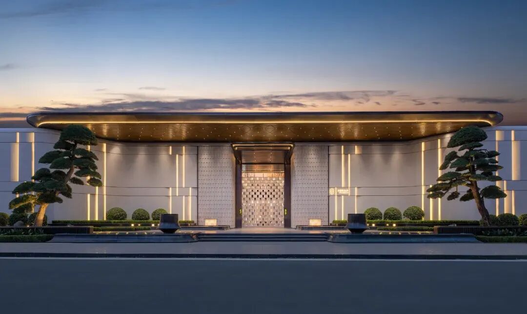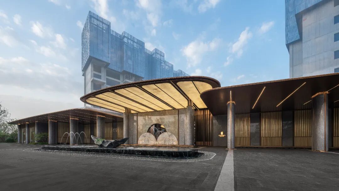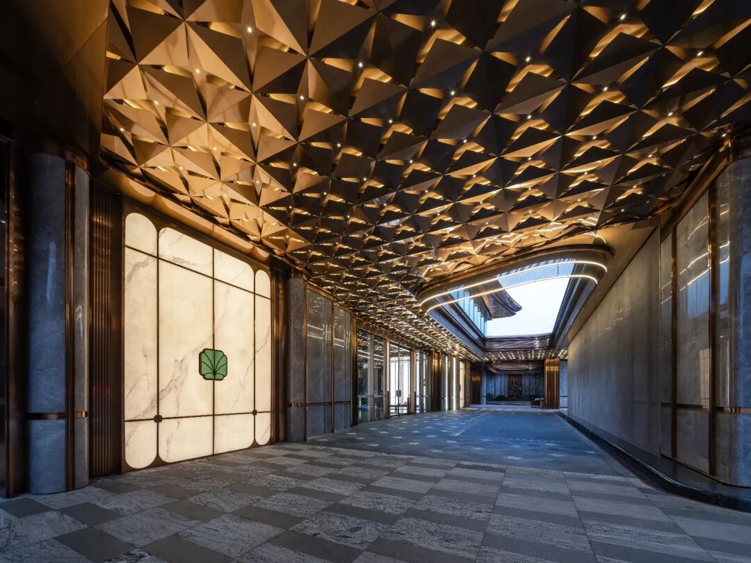 外立面通铺大面积蓝棕石材+玻璃幕墙,搭配鎏金铝板曲面与悬浮金冠,再现唐风飞檐意象神韵。