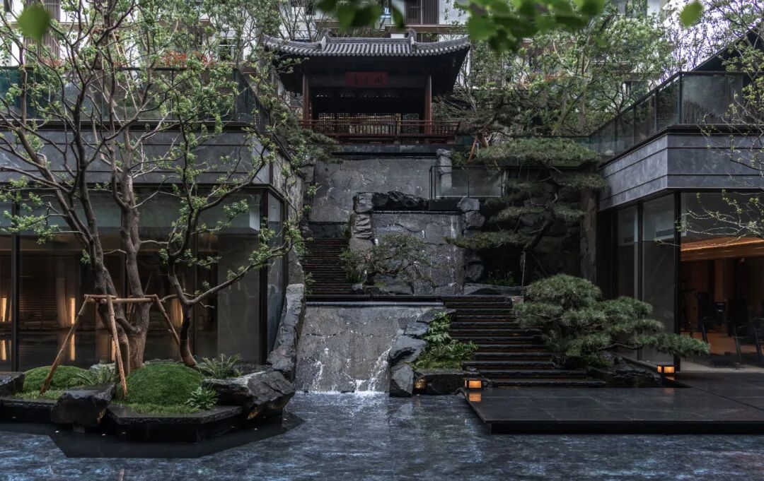 约10000㎡的唐风立体山水,通过约80吨山西黑石材的错落堆叠,还原《松荫观瀑图》中高山流水的立体画境。约8米高的云端叠瀑沿着山石崖壁倾泻而下,与错落的虬松构成“刚柔相济”的绝美构图。“一池三山”下沉式庭院水域面积约1300㎡,还原唐代宫苑宛自天开的园囿格局。
