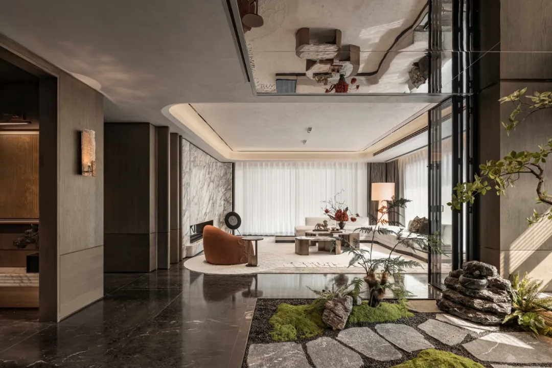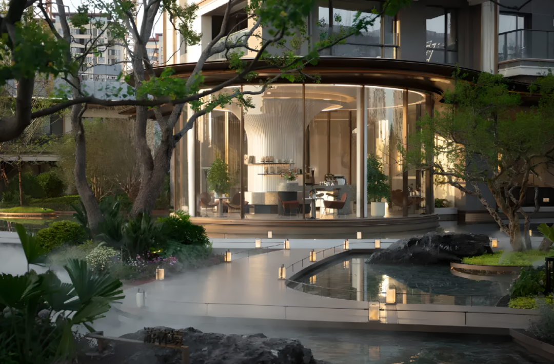 内外交融的会所式庭院,下沉式艺术社交空间,拓宽生活的边界,形成流动的无界会客厅。