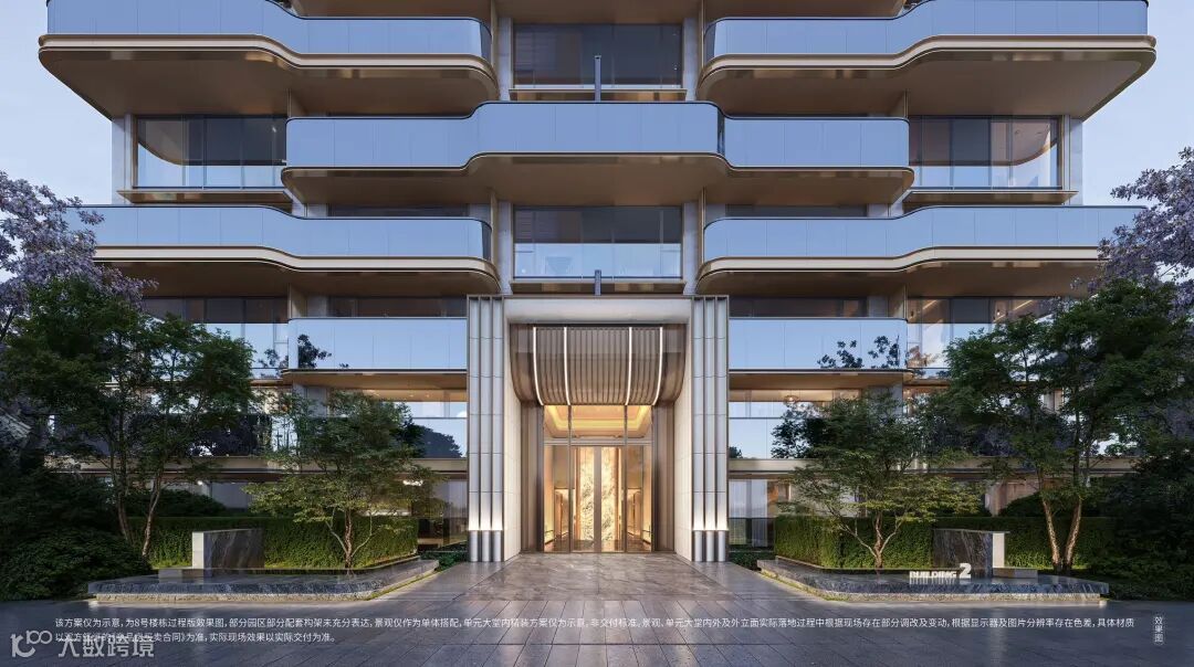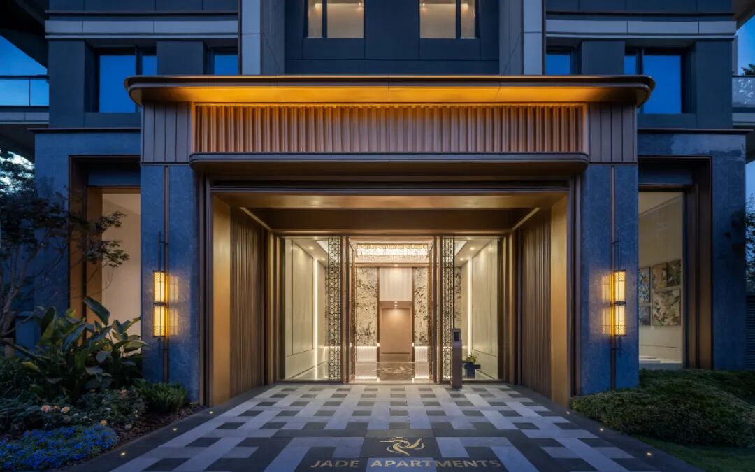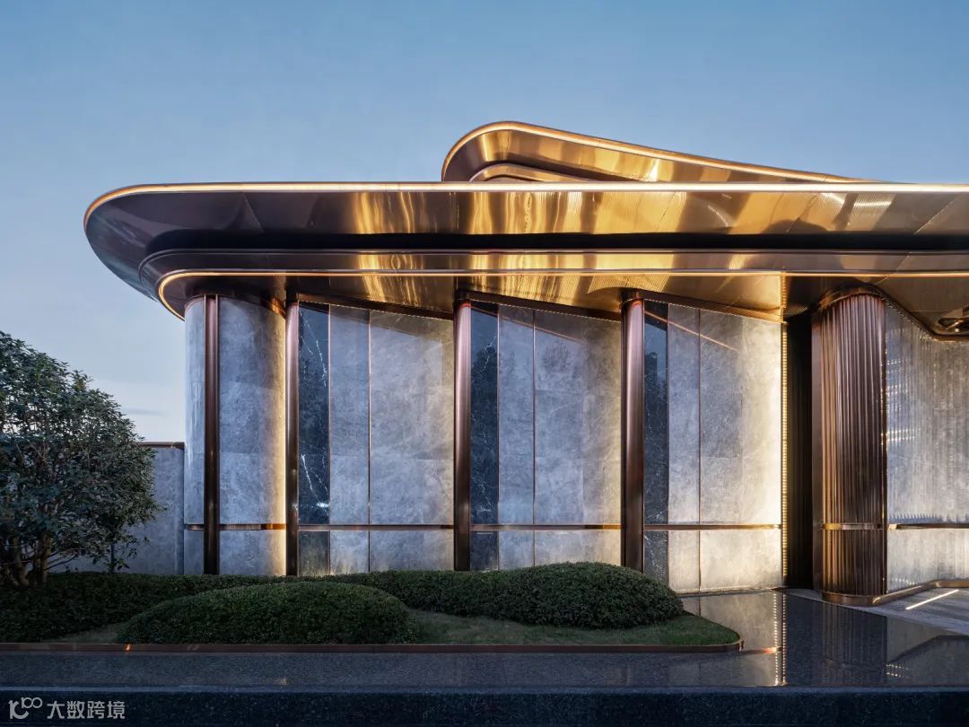 南入口景墙正中的金属屏风则成为整个立面的题眼,由八根细金属柱领衔的“七扇屏”顶奢酒店化门庭式落客空间:形式取意“玉璧飞檐,金凤来栖”的社区大堂,是中式门庭和东方美学的时尚化演绎;