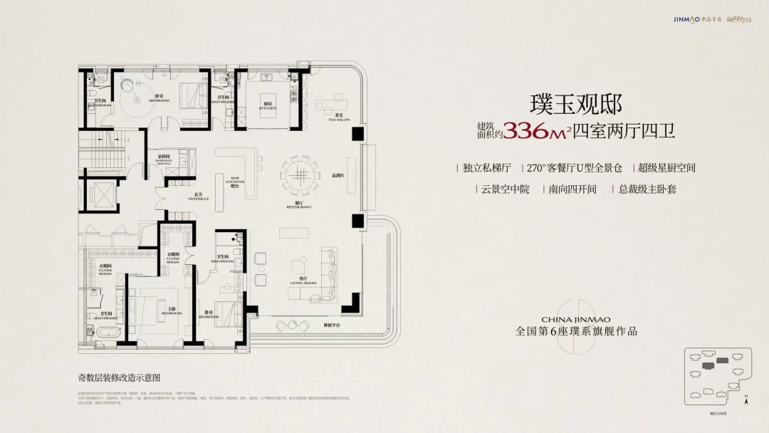 金茂璞逸东方主力产品为229-269-336㎡,其中269㎡、336㎡为全景舱设计。