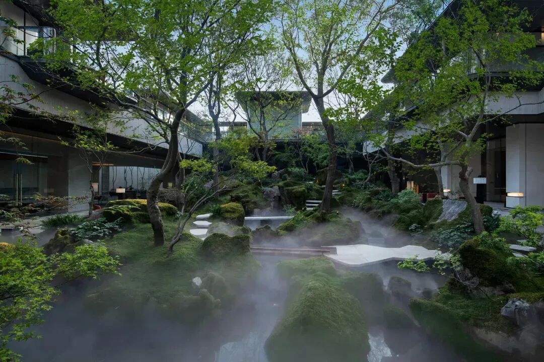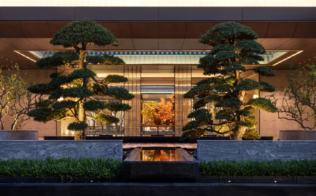 “龙鳞松韵”庭院的造景灵感,源自南宋夏圭笔下的《溪山清远图》。峭壁如屏,五株苍松盘踞奇石之上,疏影横斜间,仿佛能听见画中溪水流淌的泠泠声响。