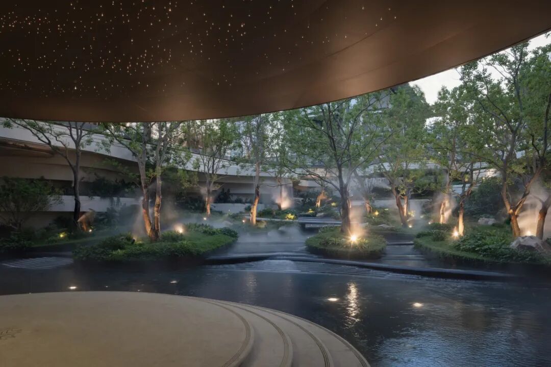 约10000㎡的唐风立体山水,通过约80吨山西黑石材的错落堆叠,还原《松荫观瀑图》中高山流水的立体画境。约8米高的云端叠瀑沿着山石崖壁倾泻而下,与错落的虬松构成“刚柔相济”的绝美构图。“一池三山”下沉式庭院水域面积约1300㎡,还原唐代宫苑宛自天开的园囿格局。