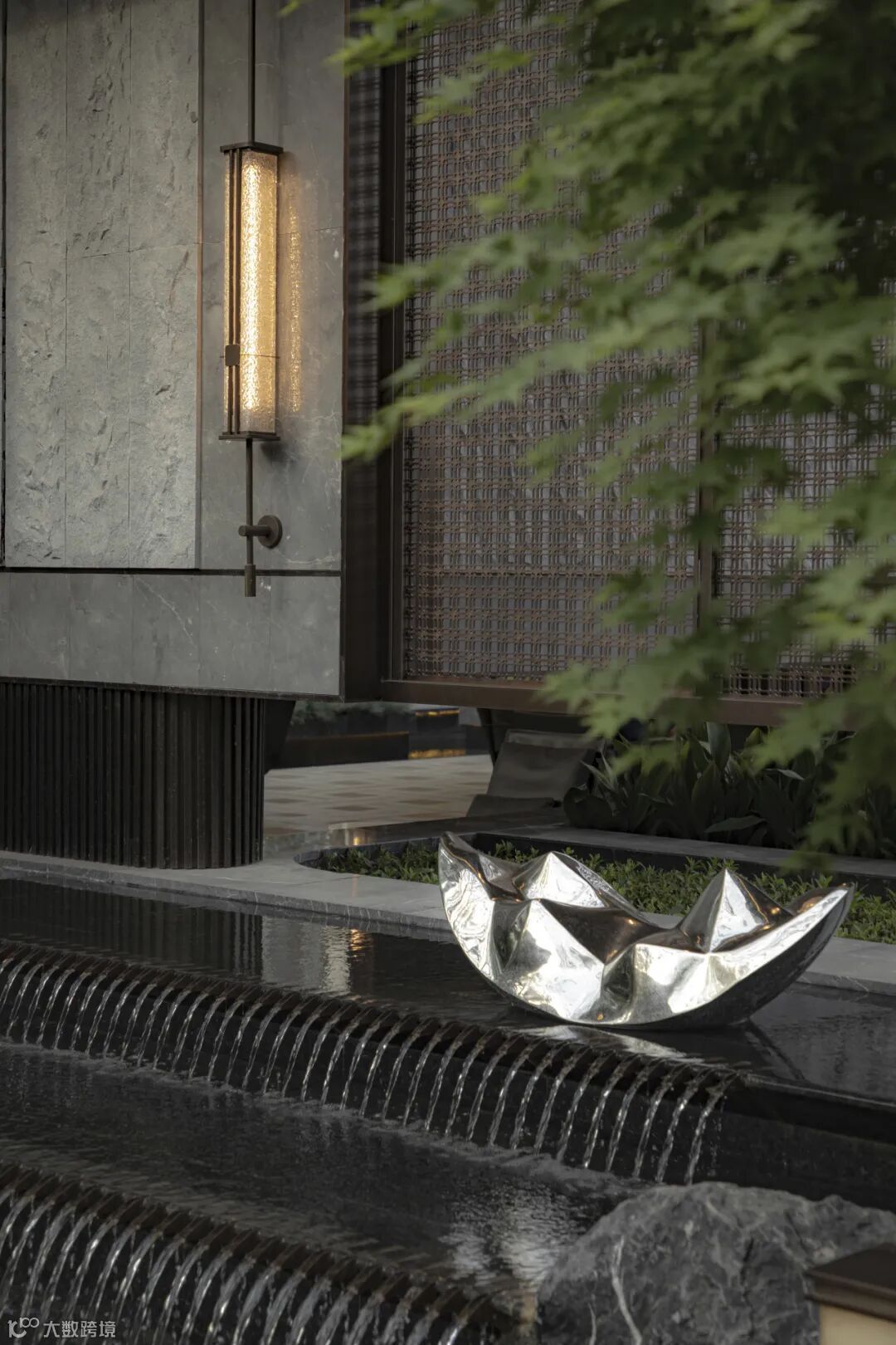 镜面水景以约400㎡的环绕尺度,将归家的步伐包裹在一片深沉静谧之中。池底选用安哥拉黑石材拼贴,点缀明亮金体,构筑出名流专属的私密底色,如暗夜中藏匿的星辰,引导居者步入内心的澄明。