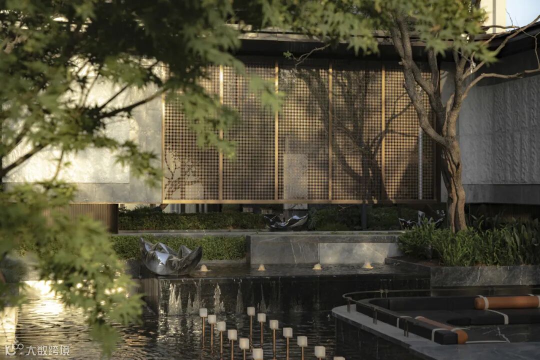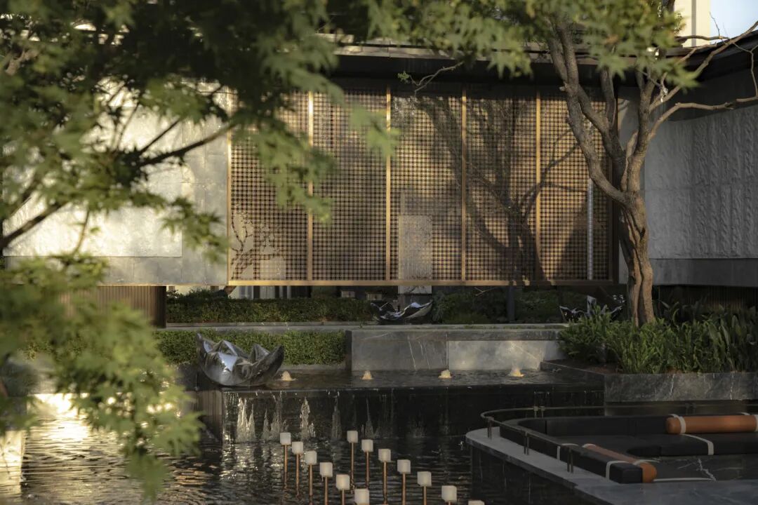 下沉卡座临水而居,藏于游廊深处,液态波纹金属与透光云石垂帘悬浮水面,浮水汀步与流光影墙构成业主私密沟通的场域。光影变幻,绿意摇曳,水波澹澹,在回眸间,感当下一瞬的美好。