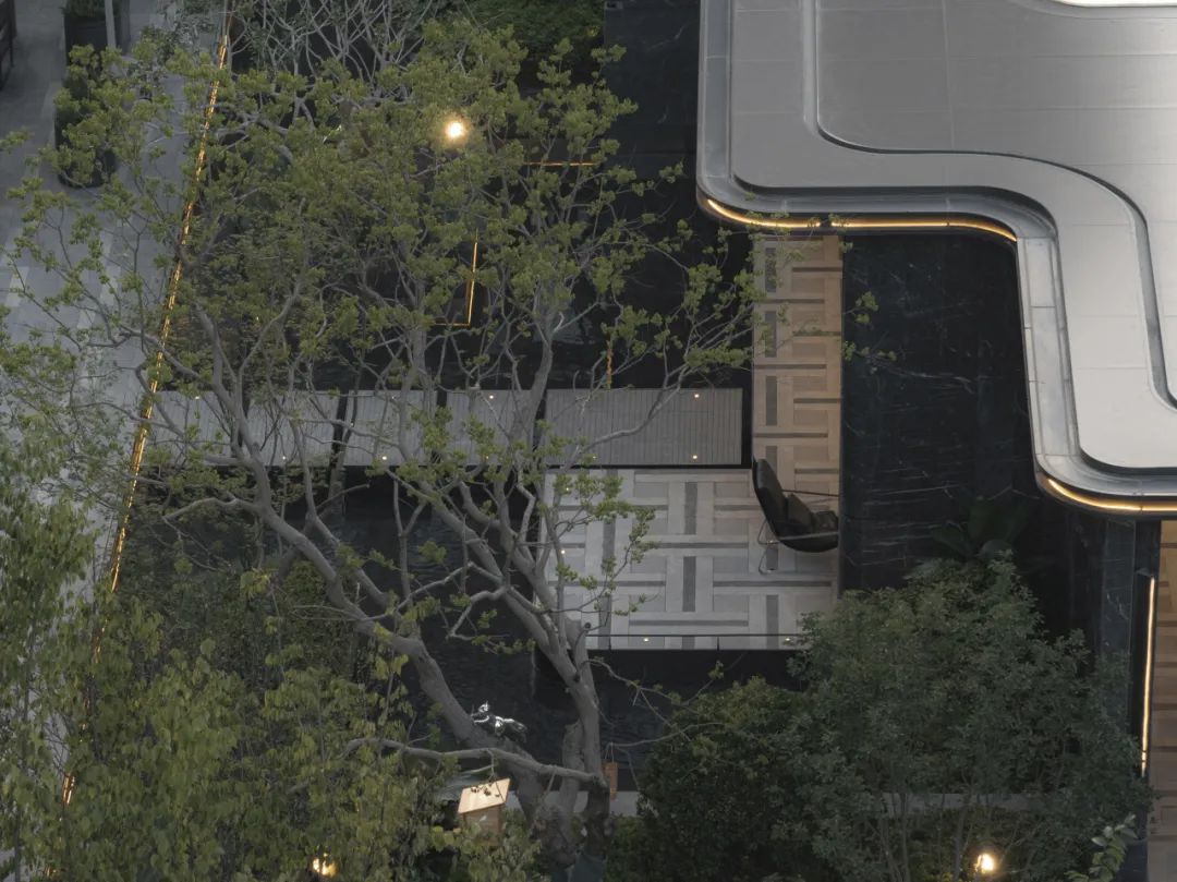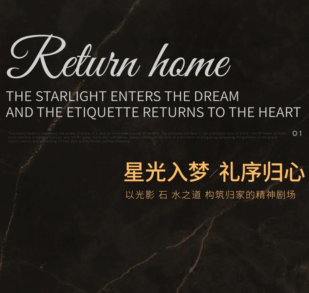 入口界面如一段悠缓的乐章——90米建筑界面沉稳铺陈,43米星空顶雨棚缓缓展开,以十米通高飞翼之姿,铺展大宅归门的恢弘气度,演绎一场酒店式品质的归家仪式。