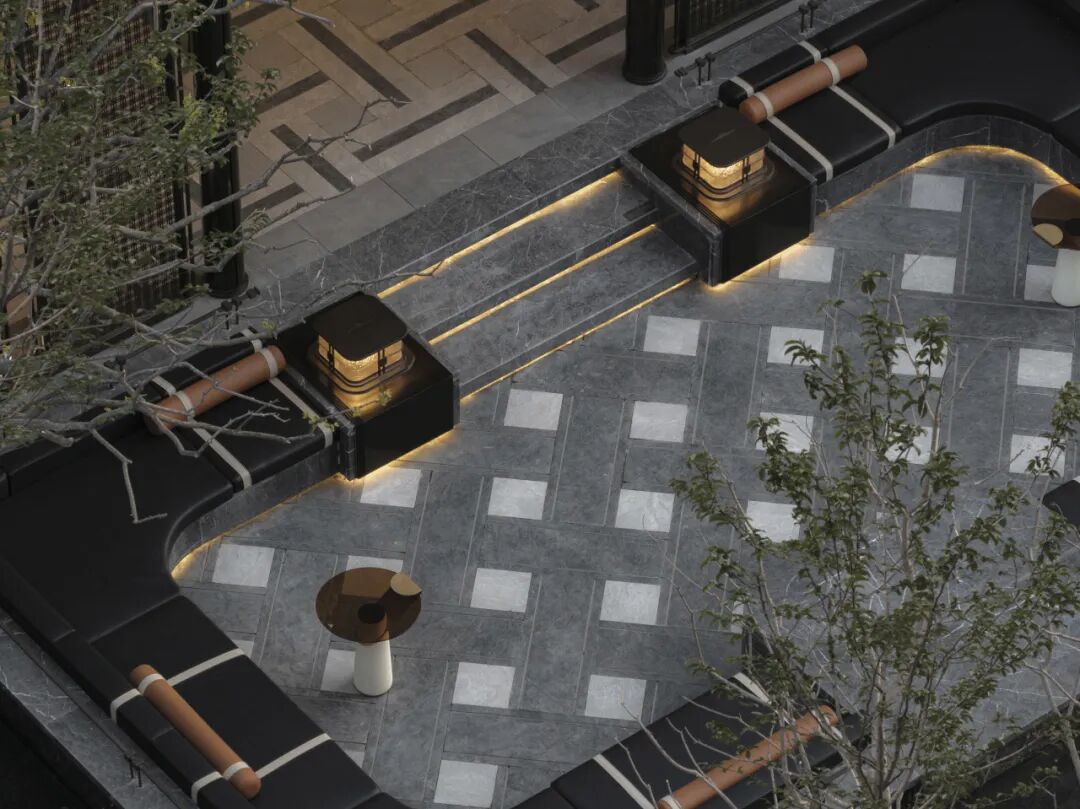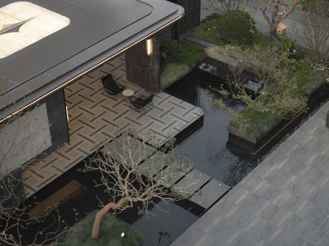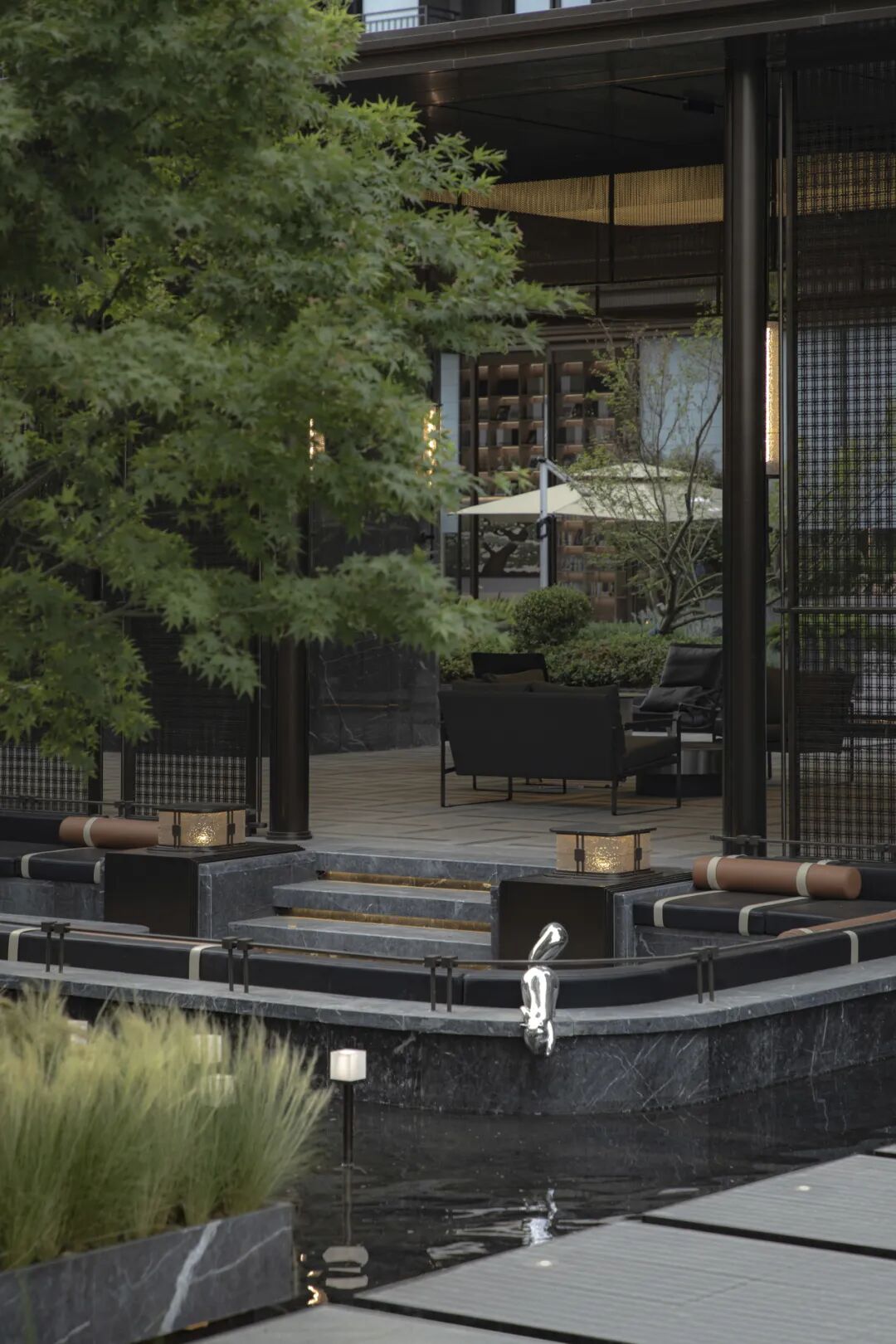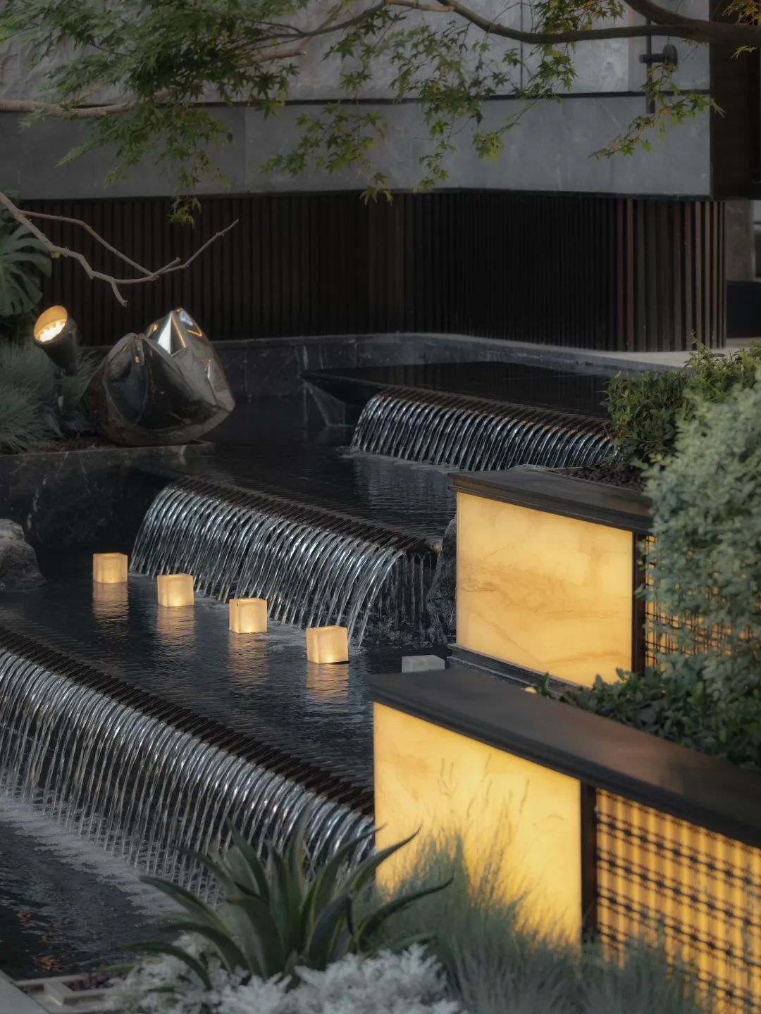水景选用安哥拉黑、温德姆灰石材,辅以“茶马古道”的马蹄印痕置石,既是对历史记忆的诗性致敬,也是材质与文化的深度对话。