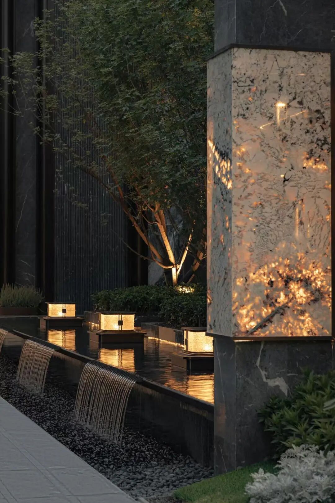 轴线之上深色水景与翠谷幽兰石柱共同围合的尊崇场域,地面拼花石材细腻入微,如一卷徐徐展开的东方画屏;透光奢石嵌入其中,在夜晚泛起如梦星光,光影交织下的金属帘轻拂风声,细节之间皆是对归属感的极致雕琢。