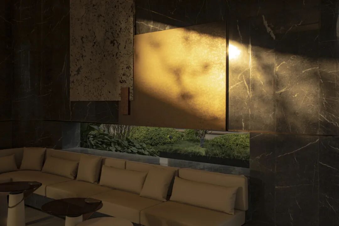180㎡酒店式廊架会客厅立于水岸之上,香槟金金属帘垂悬廊下,光与风在帘影间缠绕游走。潘多拉透光奢石温柔地嵌入水景之中,在昼夜交替之间,隐隐泛出浅金的余光,营造出似远似近、若有若无的感官沉浸感。