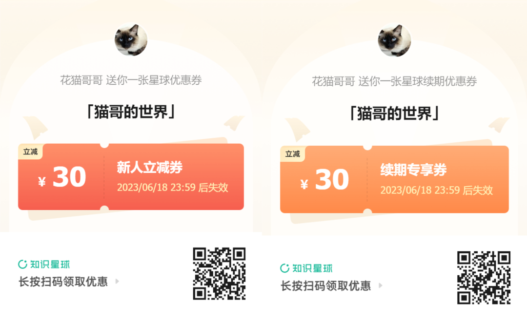一年一度的618快到了,给大家准备了30元优惠券,欢迎大家加入我的星球。本次推送第3条有详细介绍,新人券2000张,续费券1000张,优惠活动截至到6月18日23点59分:
