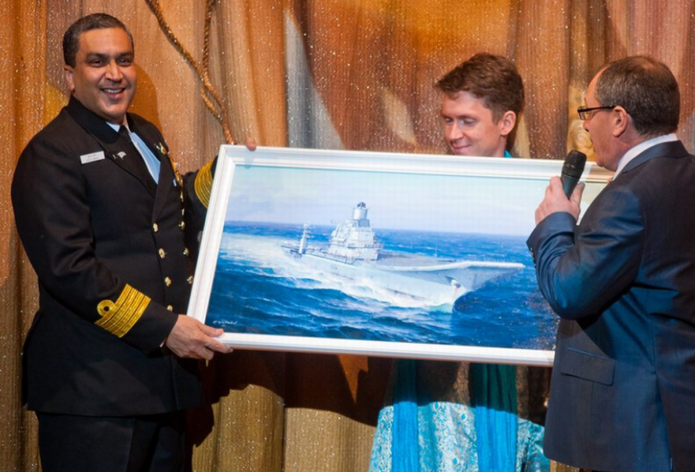 为了安抚印度人,俄罗斯派了一个代表团访问印度,为印度带了一个礼物——一幅戈尔什科夫号航母的油画。