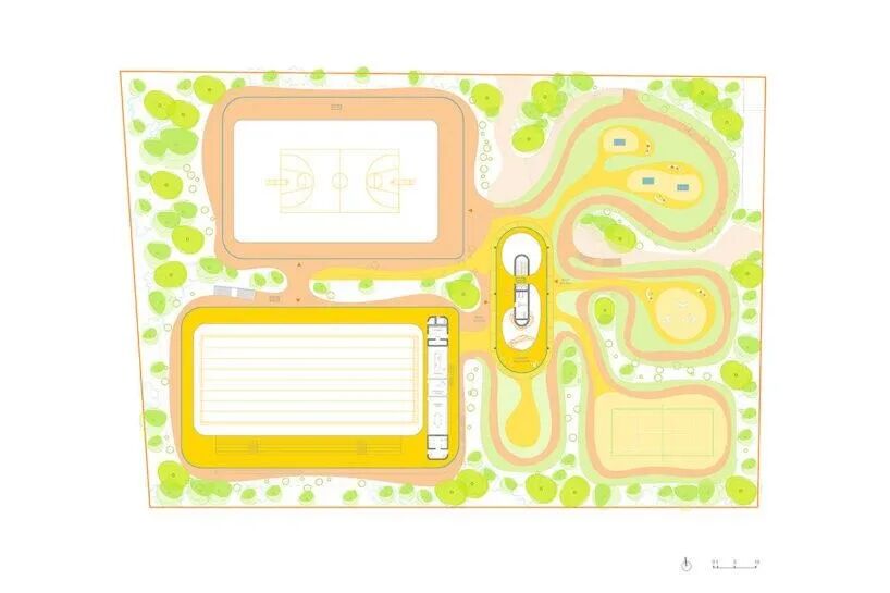 与周围高密度的发展形成对比,体育中心引入了一种植根于开放和景观融合的建筑语言。设计避免了垂直优势,而是将其分散在一系列低矮、透明的亭子上,这些亭子有大量的ETFE屋顶。每个体量都被绿色植物包围,使项目与自然环境保持一致,并为天际线的速度和规模创造了平静的平衡。