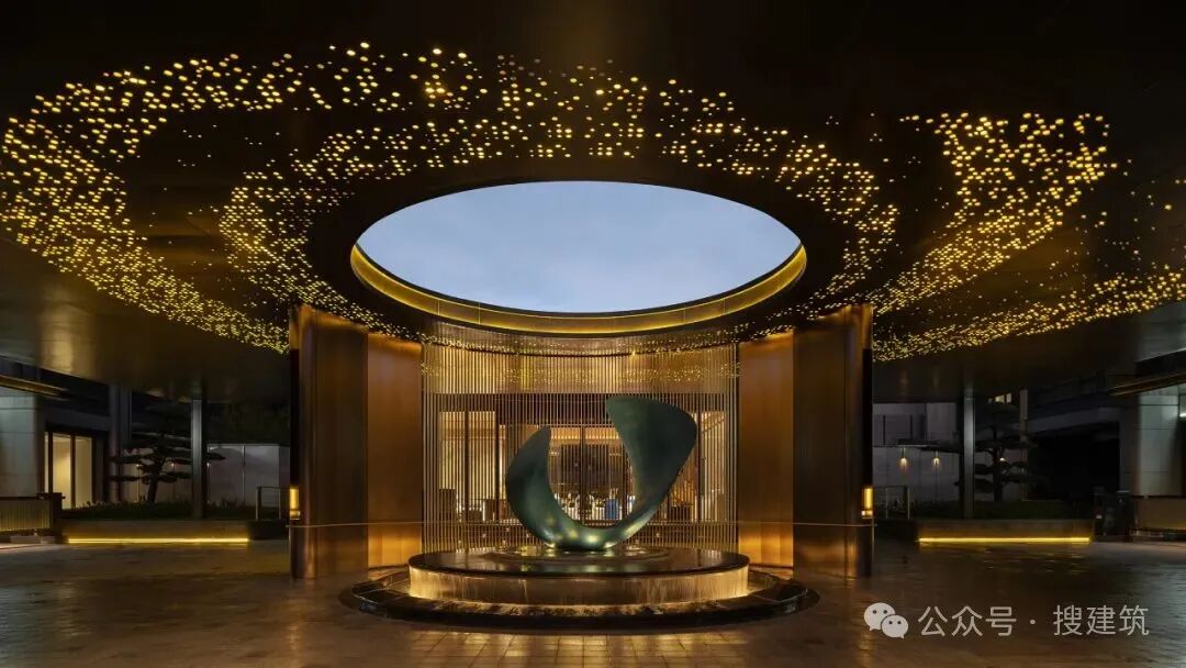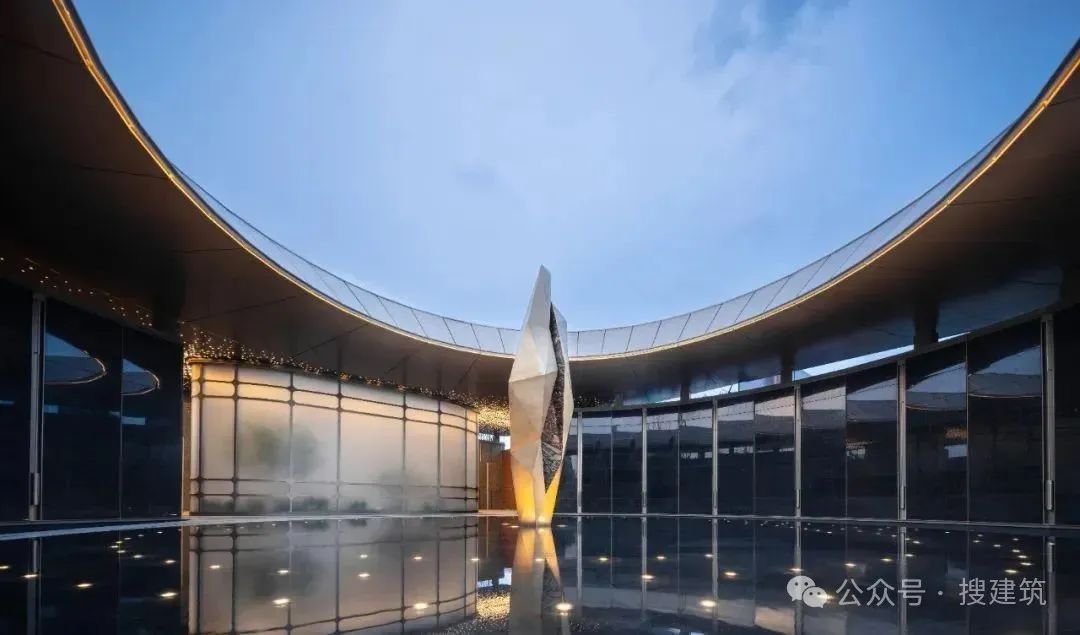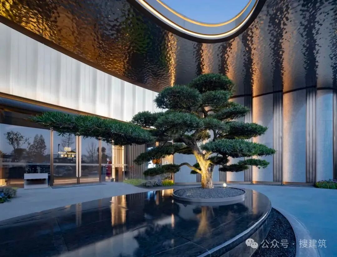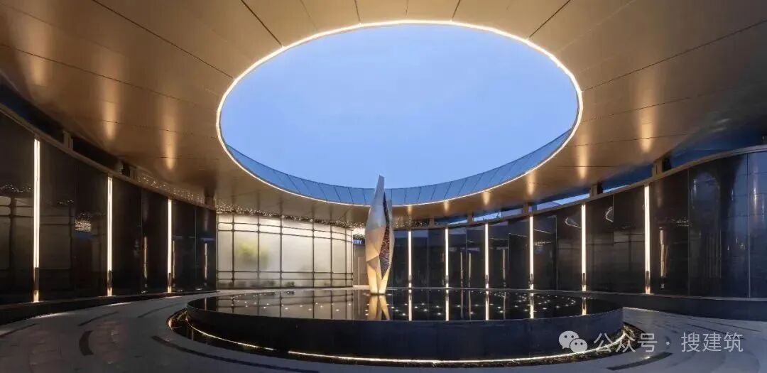 入口圆形天顶简洁的几何形式象征着完整与和谐,镜面水池映照着天空的变幻,以简洁的现代语言传递传统门庭中四水归堂所营造的“一泓碧水一泓天”的文化体验。