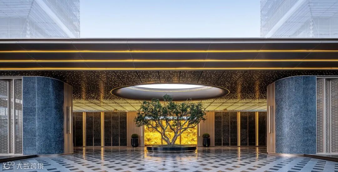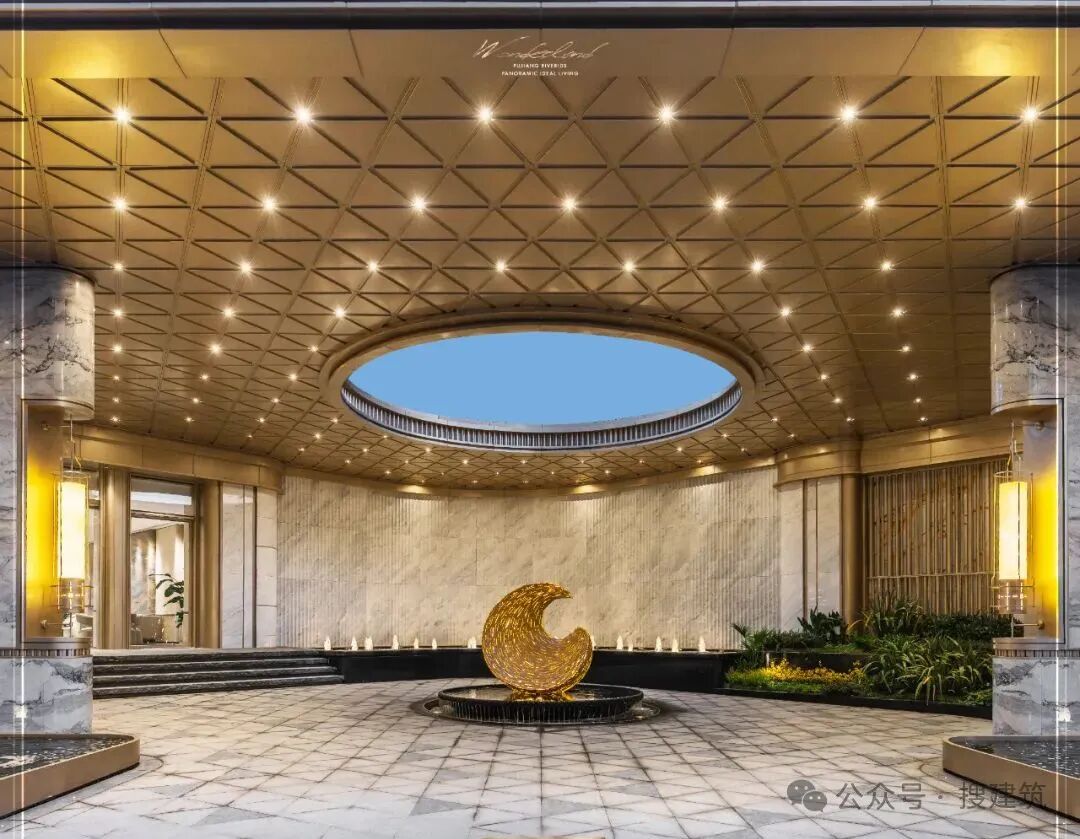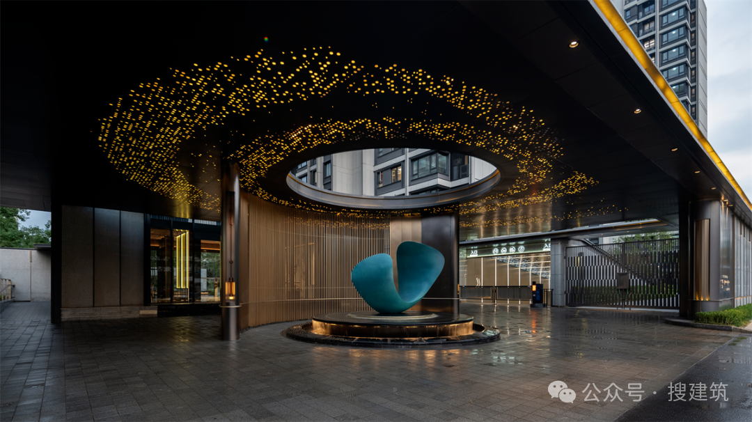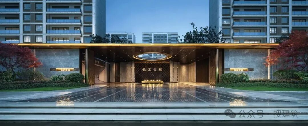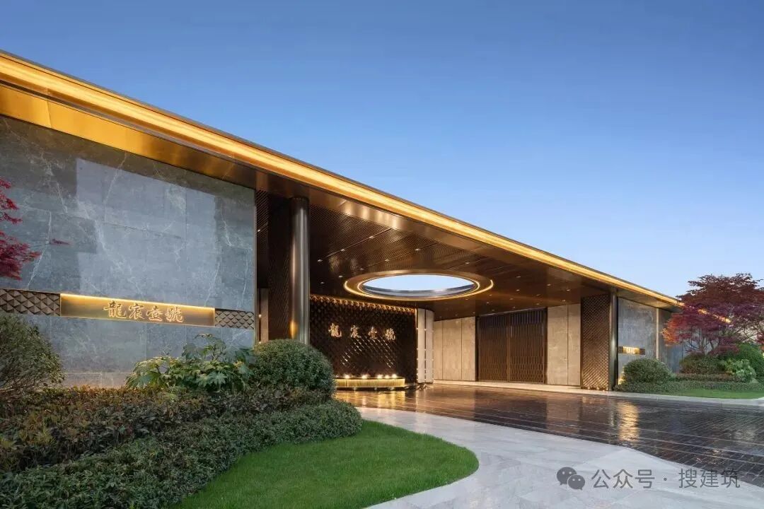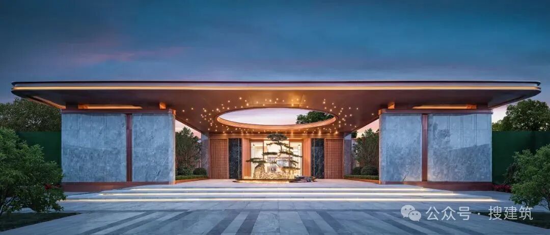 主入口创新性地配上了一座数十米长的香槟金门庭,气势恢宏,足有50米,4根巨型斗拱柱搭配人行入口顶「天圆地方」的设计,大宅仪式感十足,给予生活至高礼遇。