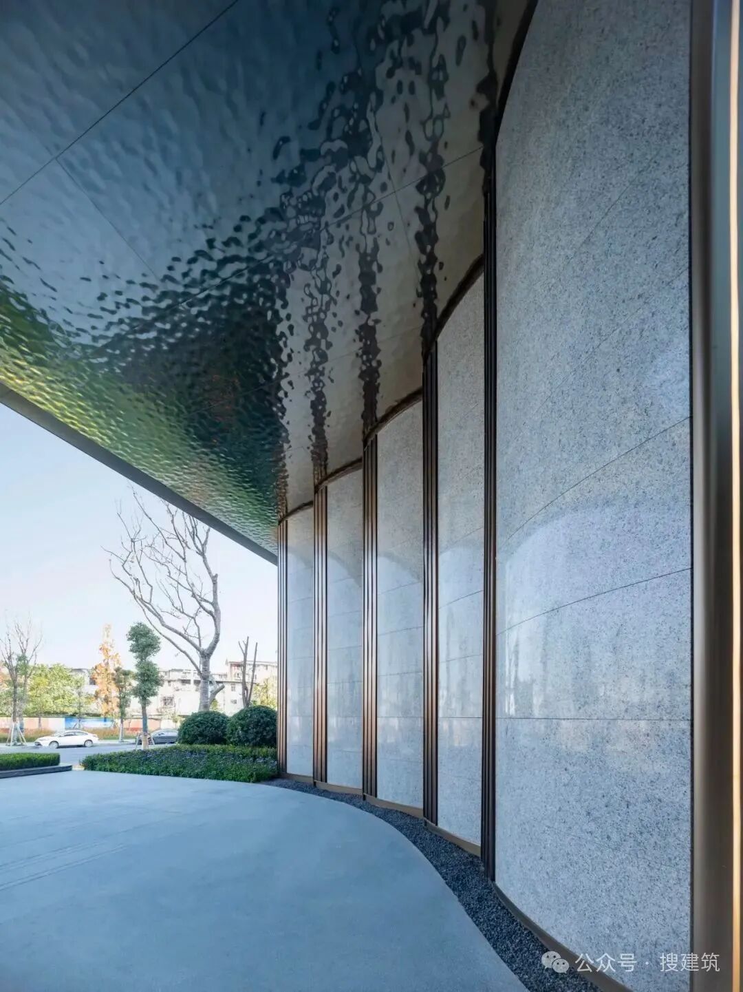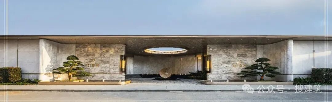 入口门头以气质文雅的浅灰色蓝眼睛石材为立面主材,弧形石材片墙渐次偏转角度排列,围合成半圆形入口灰空间。