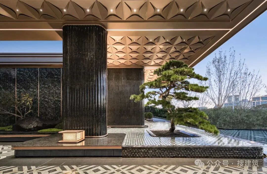 大门古铜色铝板、古铜色金属格栅、灰色石材相搭配,彰显了府邸大宅的气势。造型松、山石、星空顶,进一步营造高级感氛围。