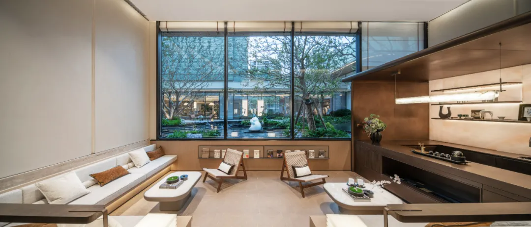 架空平台下,结合下沉庭院、打造奢隐的私家社区生活组团,融合山川河岳的东方园林与私家会所空间,形成生态自然的社区活动空间。