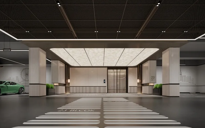 车行入口融入架空平台边界,形成一体化门头,这样开车归家也能享受到和步行归家一样的仪式感。