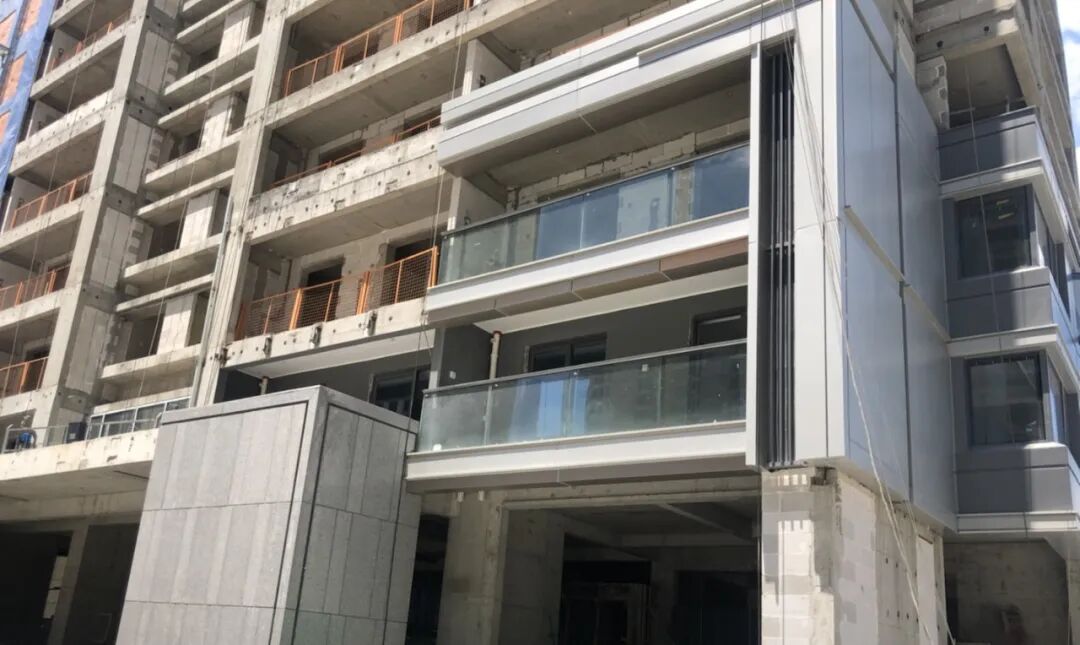 基本材料选定后,与业主共同选定搭建两层高,南北及东侧3个面的实体样板。实体上墙,对材质,构造,线脚细节进行进一步的调整优化,比如型材增减,铝板分缝,胶的颜色,层间双缝做双凹缝/双平缝/1凹+1平等很多细节。匠心精神渗透全过程,整个实体样板多轮对比,为大区品质落地做良好铺垫。