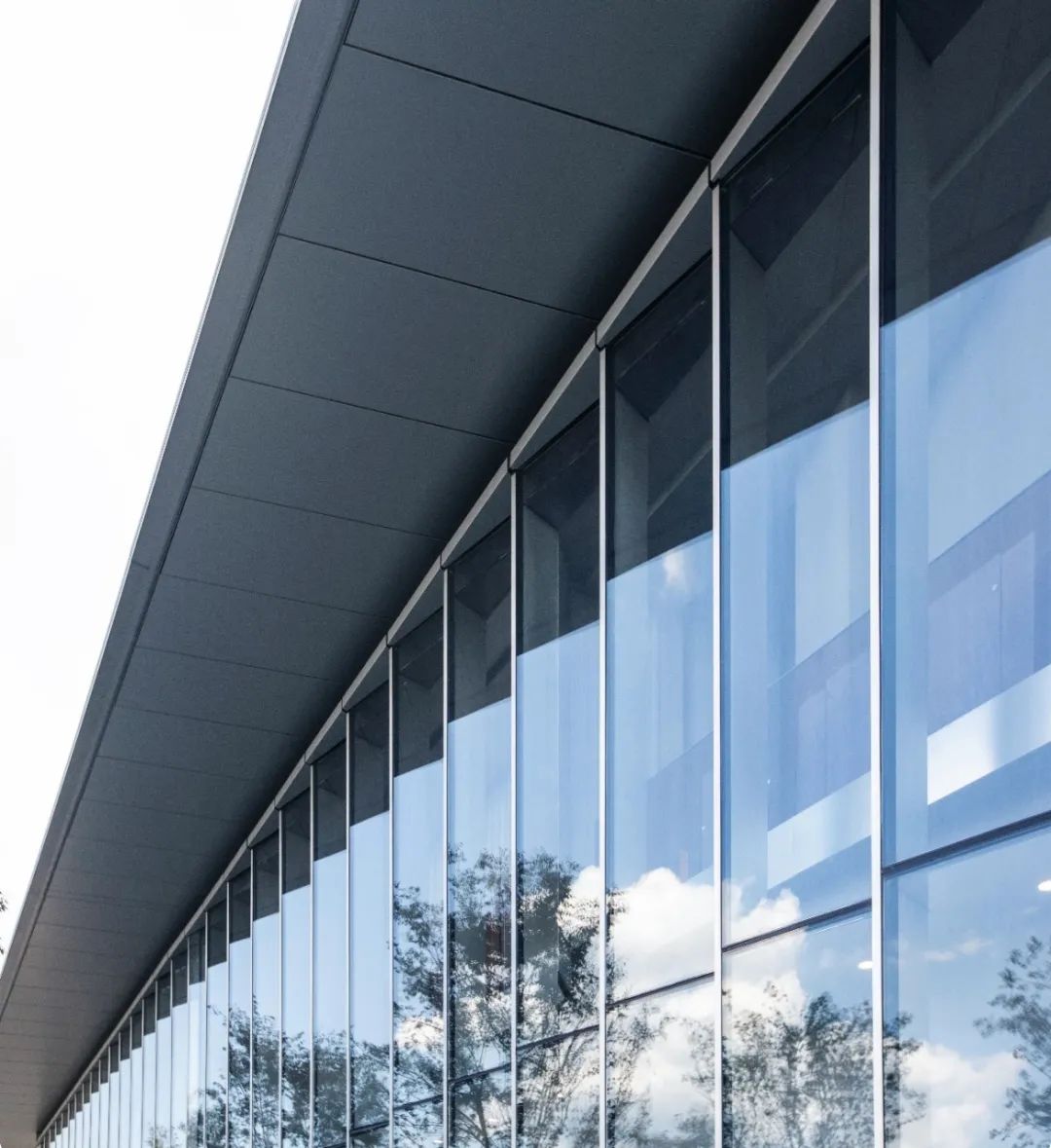 设计团队对材料的选择也极为谨慎。由于铝板在不同天气和光线下均会产生变化,经过十几轮的仔细比选才最终定样。玻璃不仅要满足节能计算要求,还要考虑颜色和反射。本项目在北立面同时有玻璃栏板(夹层无镀膜)和玻璃窗(双层中空LOW-E镀膜),视觉效果很难达到一致。通过对玻璃参数,背衬板颜色的控制,经过多轮的比选和调整,保证了最终和谐的立面呈现。