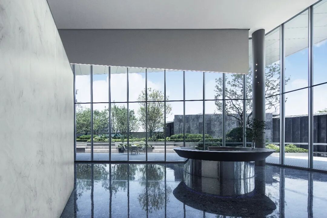 在城市界面上,设计延续宏观城市形象,以酒店化的出入口增加体验感。南大门位于TOD三轨交汇的绿汀路上,是归家的重要节点,长达16m的大雨棚为归家带来媲美奢阔酒店的尊贵感。顶部的圆形天井,让阳光,气流和微风细雨,洒落在中庭空间。以现代手法重新演绎天圆地方,人与自然和谐相处之道。