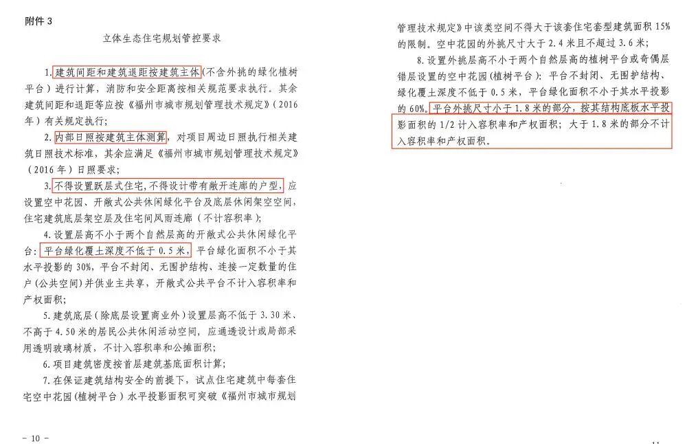 3、户属空中花园的层高不低于两个自然层高,不封闭、无围护结构,绿化覆土深度不低于0.5米,绿化面积不低于60%,出挑尺寸大于2.4米且不超过3.6米;公共休闲绿化平台的层高不低于两个自然层高,不封闭、无围护结构,绿化覆土深度不低于0.5米,绿化面积不低于30%,应连接一定数量住户并供业主共享。
